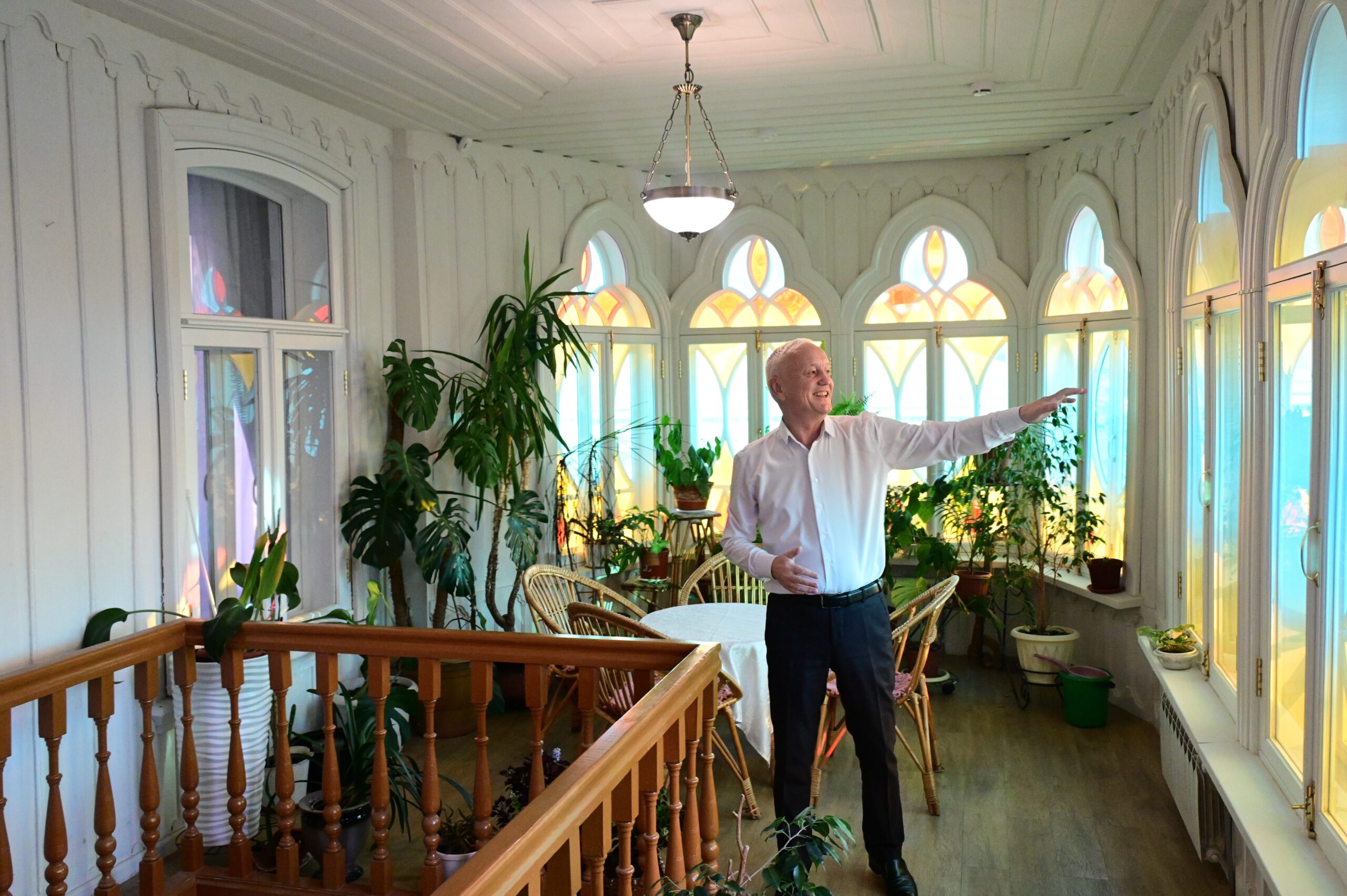 «Мы называем его Зимний сад, – отвечает Хайдар Гильфанов. – Это веранда с цветными витражными окнами, уютными плетеными стульями-столиками. Принимая гостей, пьем здесь чай и нам кажется: Камалетдин и Зайнетдин Агафуровы, два брата, так же сидели тут летом друг против друга, пили чай и, открыв окна, говорили соседям «Салям». Они вели совершенно европейский образ жизни, но были очень верующими людьми, поэтому мне кажется: это – намоленное место. Может быть, это тоже помогло сохраниться дому…».