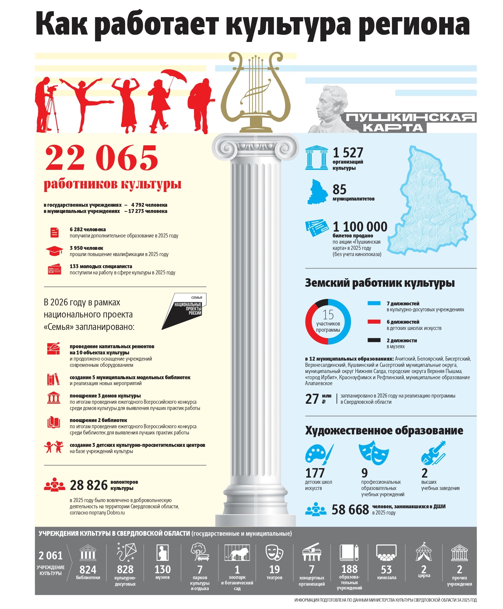 По данным Министерства культуры региона, в этой сфере на данный момент трудятся более 20 тыс. человек, в добровольческую деятельность за 2025 год было вовлечено почти 29 тыс. волонтеров культуры, а на программу «Земский работник культуры» в нынешнем году заложен 27 млн рублей. Подробнее – в инфографике «ОГ».