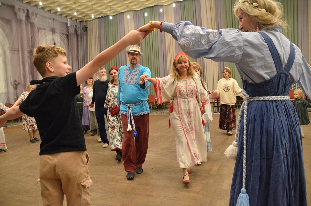 Вечора началась с игры-знакомства «Я по горенке иду»: каждый должен был подойти к другому и хлопать в ладоши под народные песни. Игра задала ритм встречи. Дети постепенно втягивались, а взрослые забывали о своей серьезности.