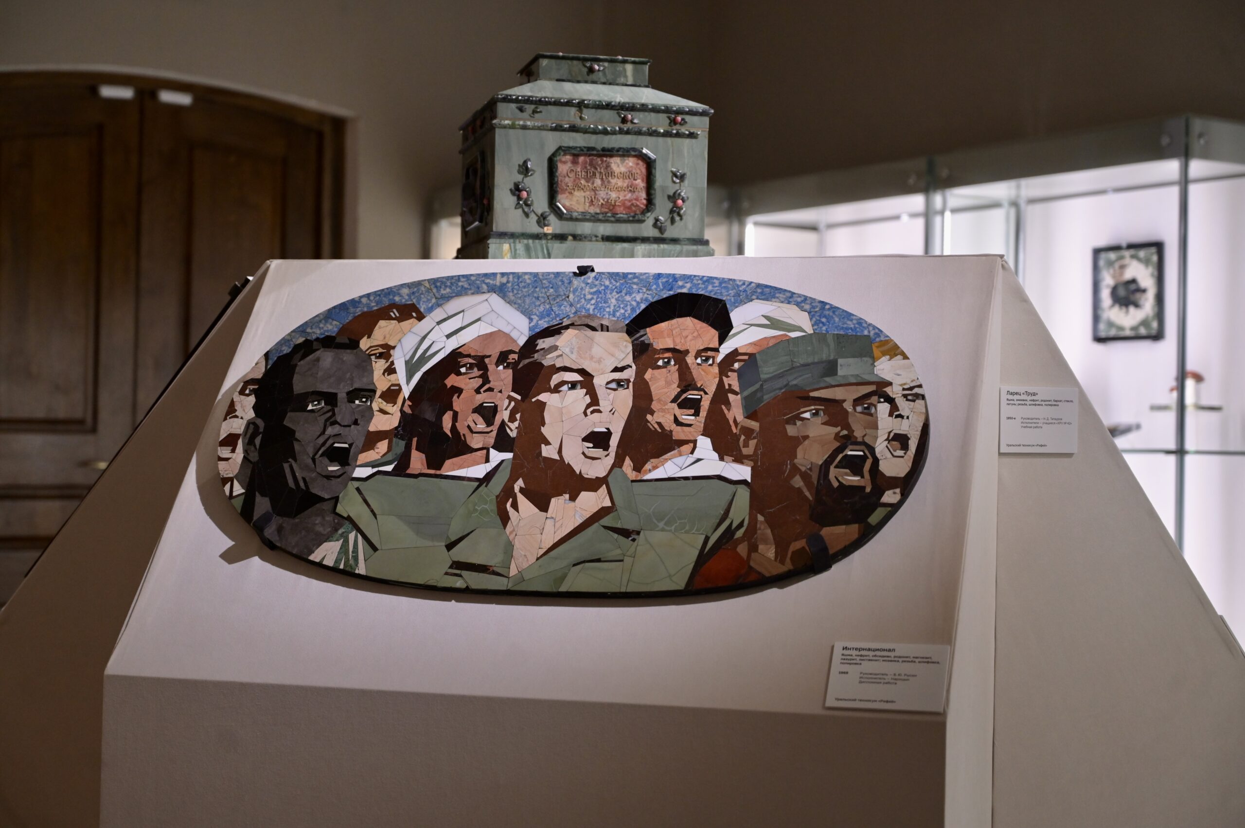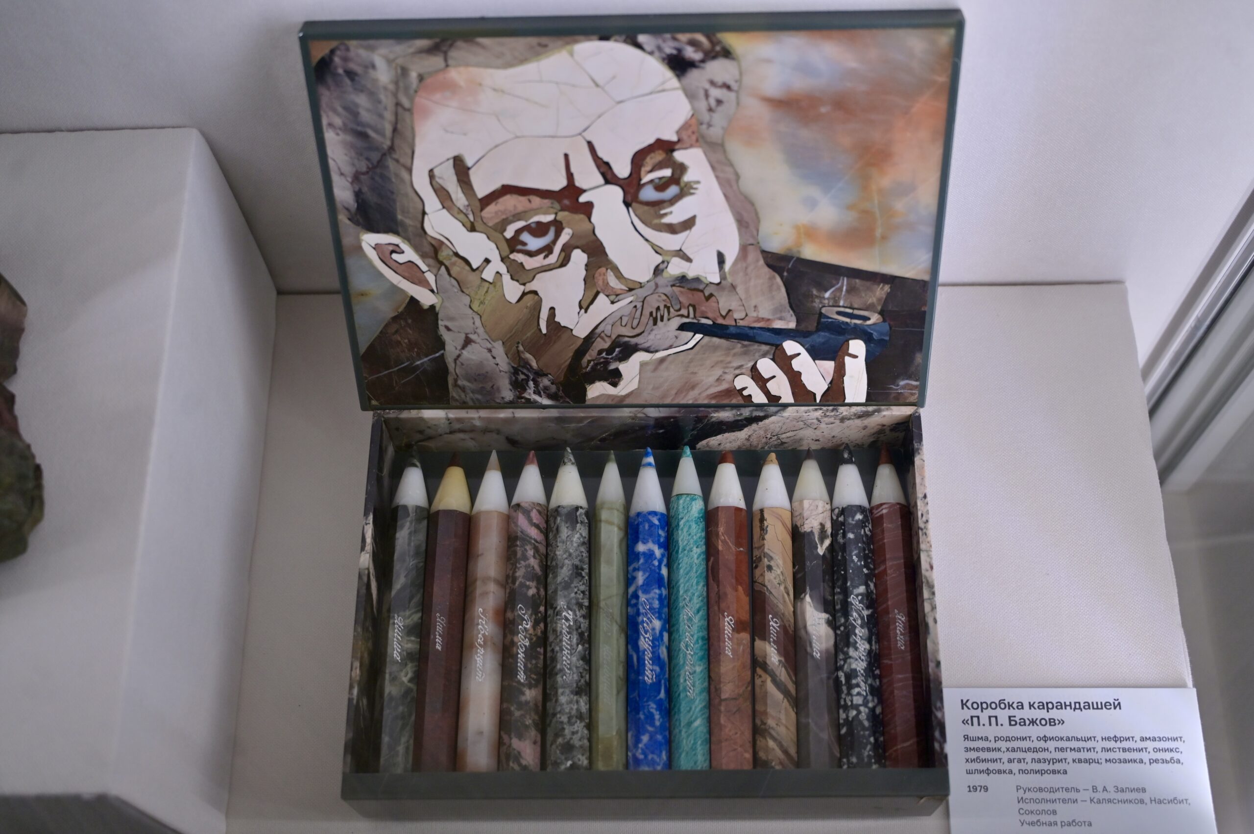 Композиция «Урал кует Победу» занимает цент­ральное место экспозиции и, безусловно, привлекает внимание каждого. В этой работе соединились традиции каменных «горок», объемной мозаики и декоративных панно из поделочных камней. Также на выставке можно увидеть несколько ярких работ в жанре анималистики, абстрактной композиции, разные вариации ваз. Темы нашего региона воплощены, например, в композиции из трех фигурок «Уральский перепляс» (1988) и уникальной коробке с карандашами «П.П. Бажов» (1979), где каждый карандаш выполнен из определенного камня – лазурит, несколько сортов яшмы, родонит, амазонит, кварцит… Любопытно раскрыта и тема космоса – это панно «Космонавты на неизведанной планете» (1984) и портрет Юрия Гагарина (1970-е). В 90-е юных художников вдохновляли звезды эстрады и киноартисты – в частности, в экспозиции можно увидеть скульптуру «Чарли ­Чаплин» (1997).