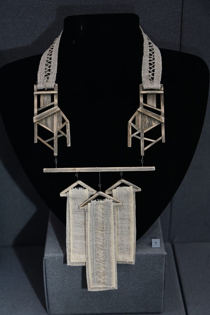 Гран-при конкурса эксперты присудили Белле Каган-Розенцвейг из Магнитогорска за колье под названием «Театр абсурда». Материалы максимально просты – линейки из древесины, лен, двунитка, а вот идея гораздо любопытней.