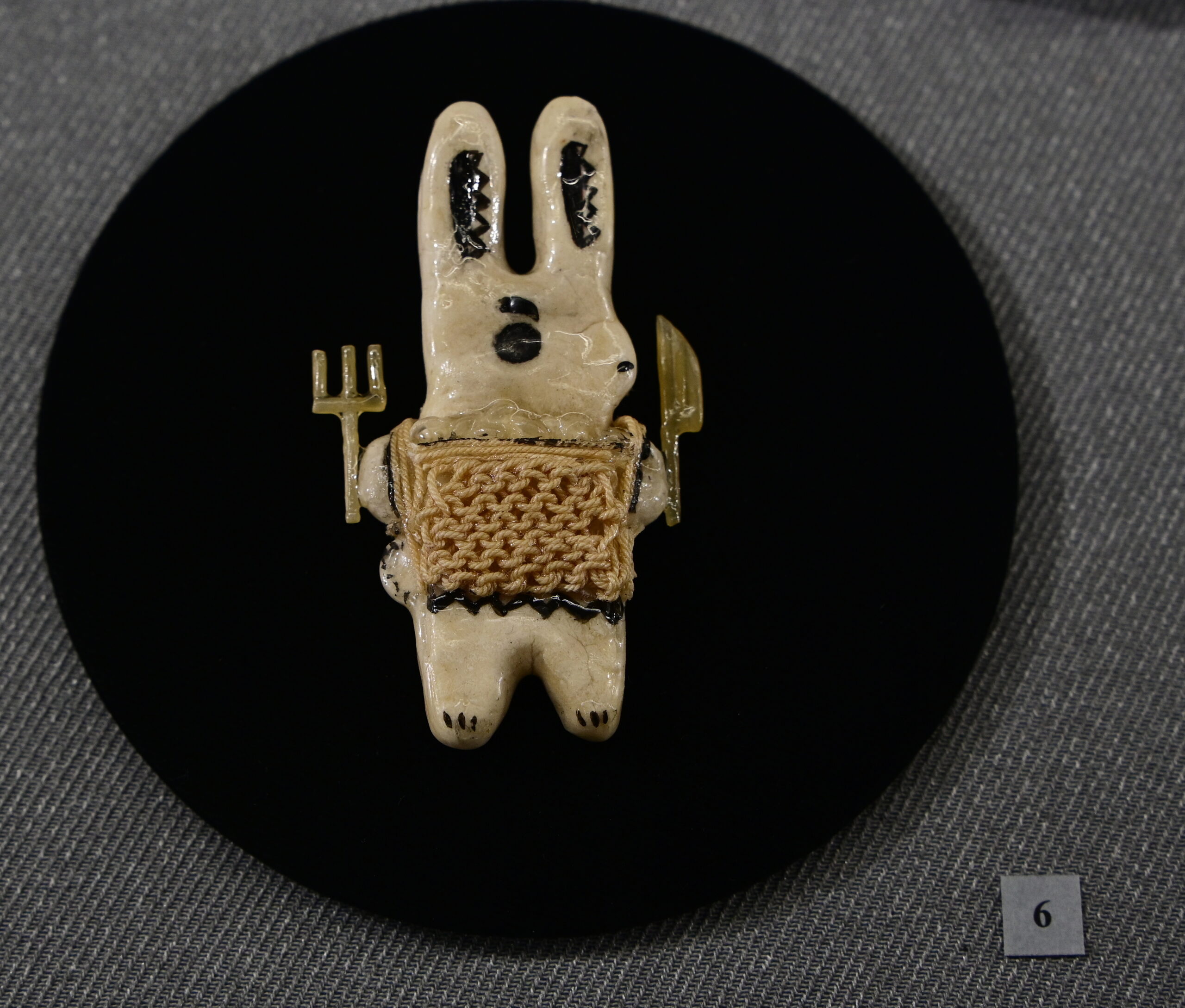 Еще один пример нетривиального отношения к материалу продемонстрировала Дарья Панова из Магнитогорска. Автор предложила для конкурса брошь «ЛапШиШный зайка» (2-е место). Создан малыш из спагетти, теста, пряжи, акрила и эпоксидной смолы.