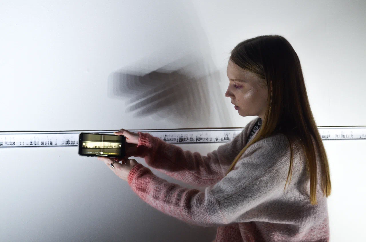 И правда, случается магия. Стоит навести телефон на поверхность ленты и из динамиков раздается звук. Настраиваешь правильную частоту: слышишь голос родных художницы. Чуть прерывистый, но даже для зрителей он почему-то становится своим.