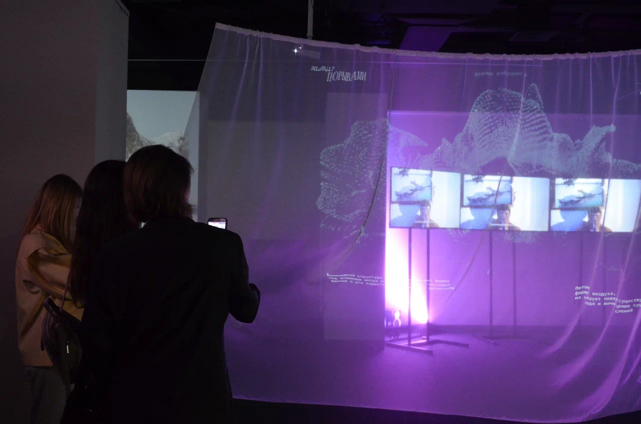 Выставка наполнена интерактивными инсталляциями. Например, «Цепь» Славы SAF реагирует на движение человека. Людей становится больше, цепь меняет траекторию света, подстраивается под толпу, словно живая. А рядом работа «Между порывами» Елизаветы Юнг. Художница исследует связь времени и пространства через ветер. От одной стены к другой растянулось большое прозрачное полотно, а на нем – ветер. Цифровой. Почти настоящий. Подходишь ближе и вдруг ощущаешь в закрытом помещении легкое дуновение. «Материя» ветра движется прямо на глазах, меняет направление, и на секунду забываешь, что всё это код и пиксели.