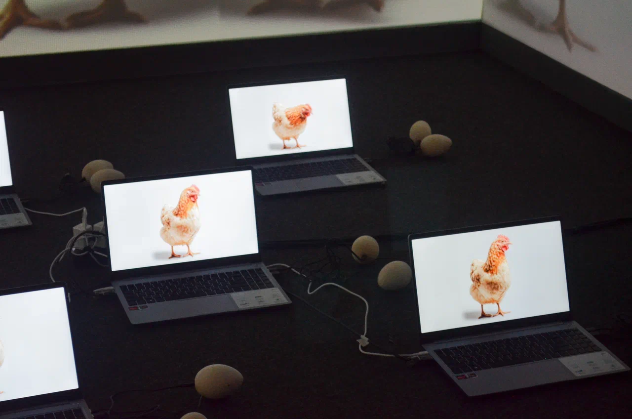 Рядом на стене выведены изображения кур. Их много – десятки. Мы оказались в инкубаторе. В прямом смысле: в отдельном пространстве расположились ноутбуки, проводами присоединенные к яйцам, вырезанным из дерева. Художница Кристина Агеева в «Цифровом инкубаторе» задает вечный вопрос: «Что было первым – курица или яйцо?» Но здесь он трансформируется в нечто более острое и современное: «Человек создал искусственный интеллект или искусственный интеллект создал человека?» Сегодня цифровой мир, в котором мы уже живем, формирует новый слой реальности. Однако не стоит забывать: все новые технологии когда-то выросли из предметного мира, созданного самим человеком.