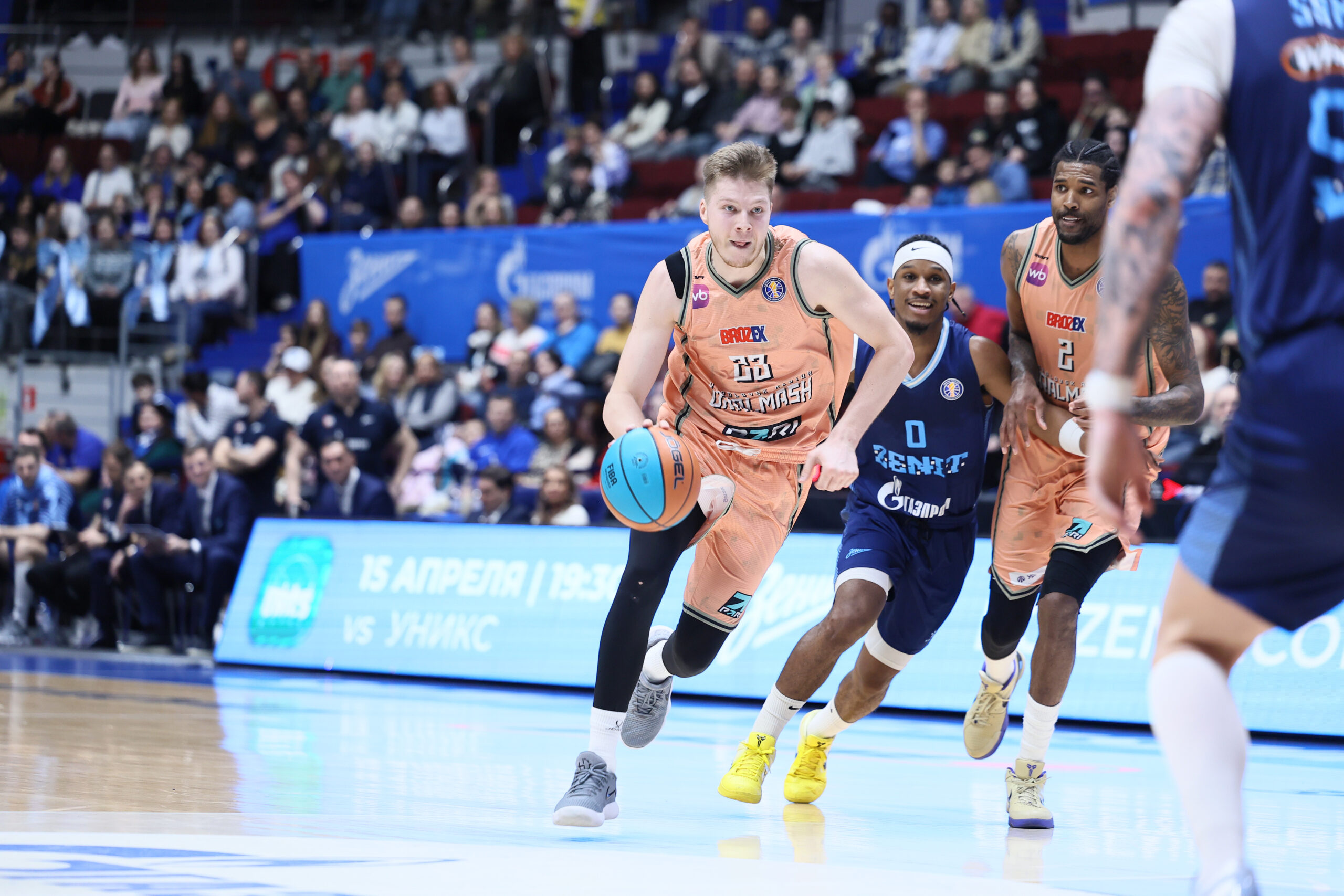 Матч с «Зенитом» в Санкт-Петербурге начался ярко. В первой четверти обе команды показывали зрелищный и равный баскетбол. Стартовая десятиминутка завершилась с равным счетом – 24:24. Во второй четверти команды стали играть менее открыто и завершили первую половину матча с минимальным преимуществом «сине-бело-голубых» – 41:39. Перерыв явно пошел на пользу свердловской команде. «Заводчане» воспользовались потерей концентрации игроков «Зенита» и полностью забрали игру под свой контроль. По итогам третьей четверти клуб из Екатеринбурга уже вел с разницей в пять очков – 61:56. В концовке «Уралмаш» вновь не позволил оппонентам догнать себя и даже смог увеличить отрыв до 13 очков – 82:69. Лучшим игроком матча стал центровой «Уралмаша» Октавиус Эллис, оформивший дабл-дабл – 21 очко и 11 подборов.