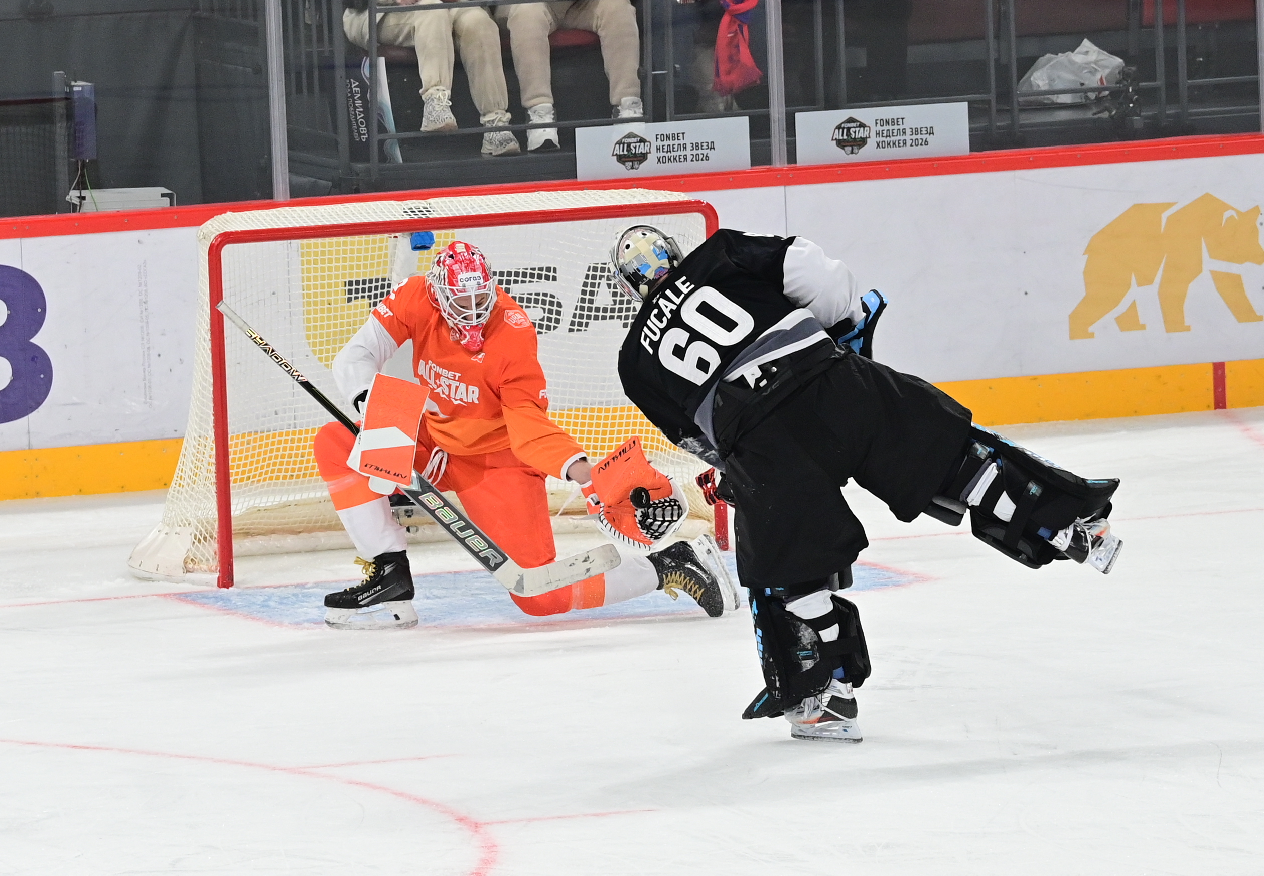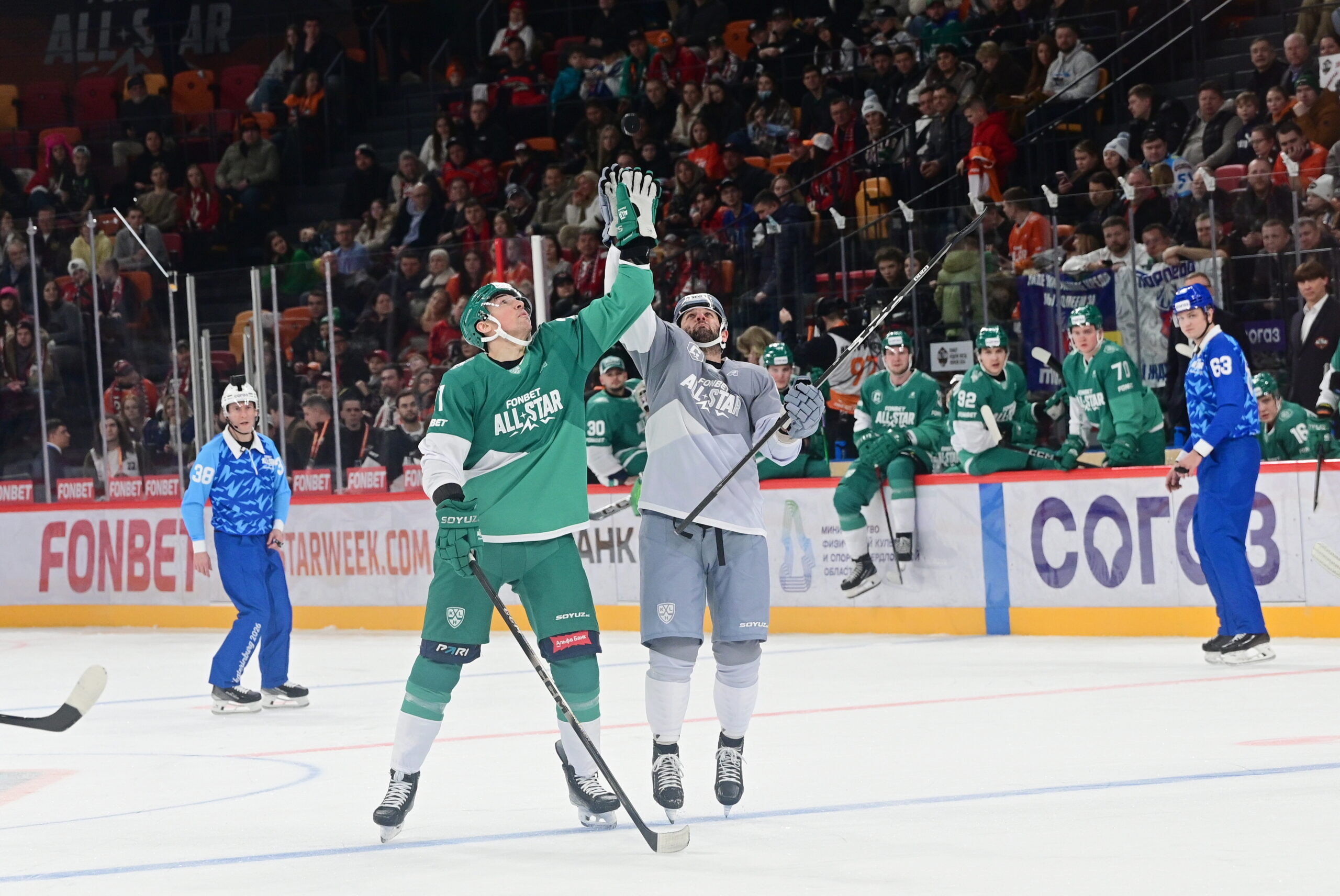 Нужно сказать, что, конечно, мини-турнир в формате Матча всех звезд – это прежде всего шоу для зрителей. Здесь нет запредельных скоростей, нет силовых приемов, борьбы и прочих атрибутов традиционного хоккейного матча. Все хоккеисты нацелены на красивый хоккей, не особо мешают соперникам создавать красивые моменты, а зачастую матч прерывался на разные элементы шоу. Например, были и вратарские «драки», больше напоминавшие вальс, были и удаления судьи: да-да, после столкновения игрока KHL Urals Stars Григория Дронова с судьей хоккеист отправил арбитра на скамейку штрафников. В общем, хоккеисты старались сделать так, чтобы зрителям на трибунах было максимально интересно наблюдать за происходящим.
