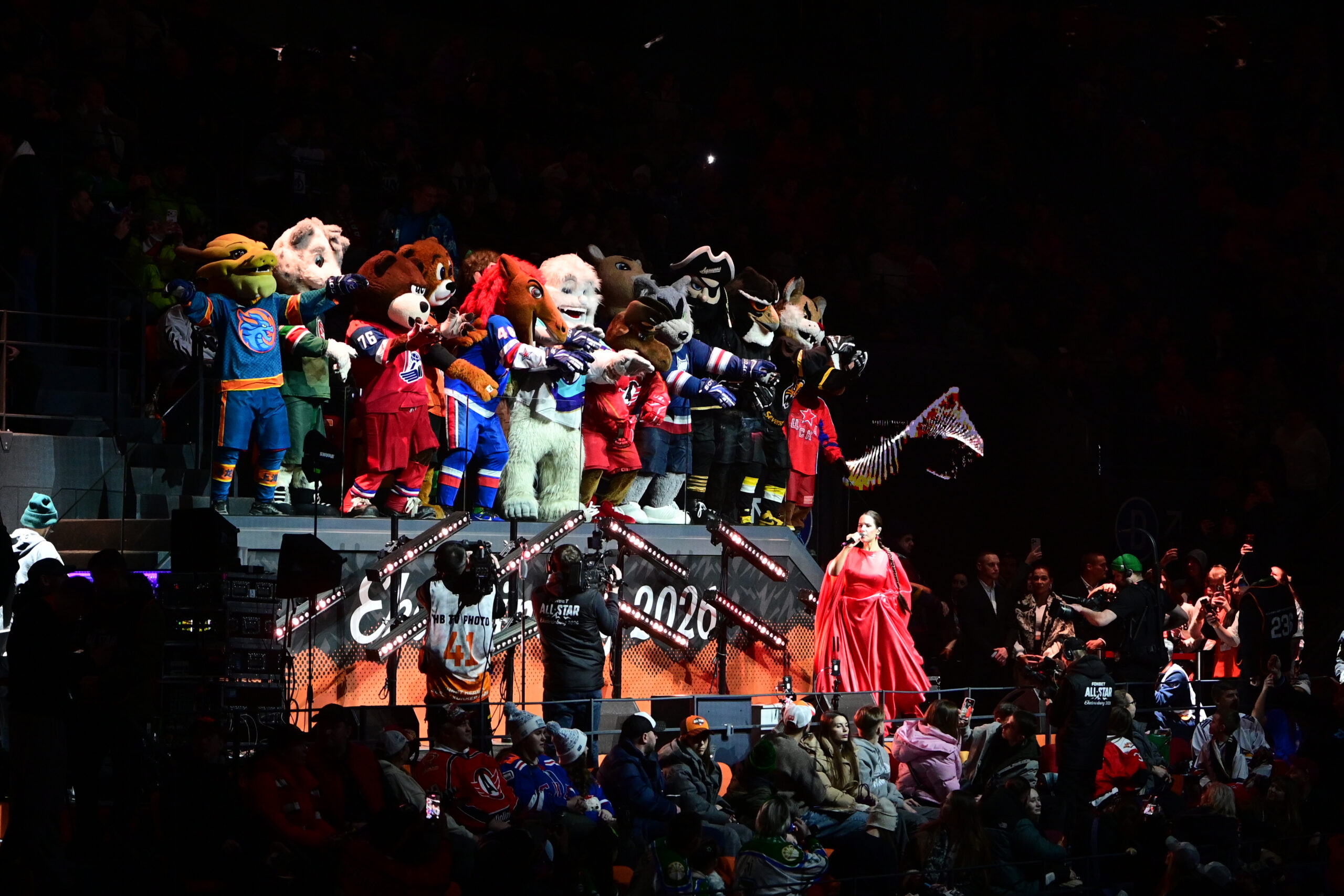 Отдельно стоит отметить предматчевые шоу, которые были организованы прямо на льду арены. Они были тесно связаны со Свердловской областью, с Уралом, зрители увидели выступление фигуристов, профессиональных гимнастов и даже полет над ареной золотого феникса.