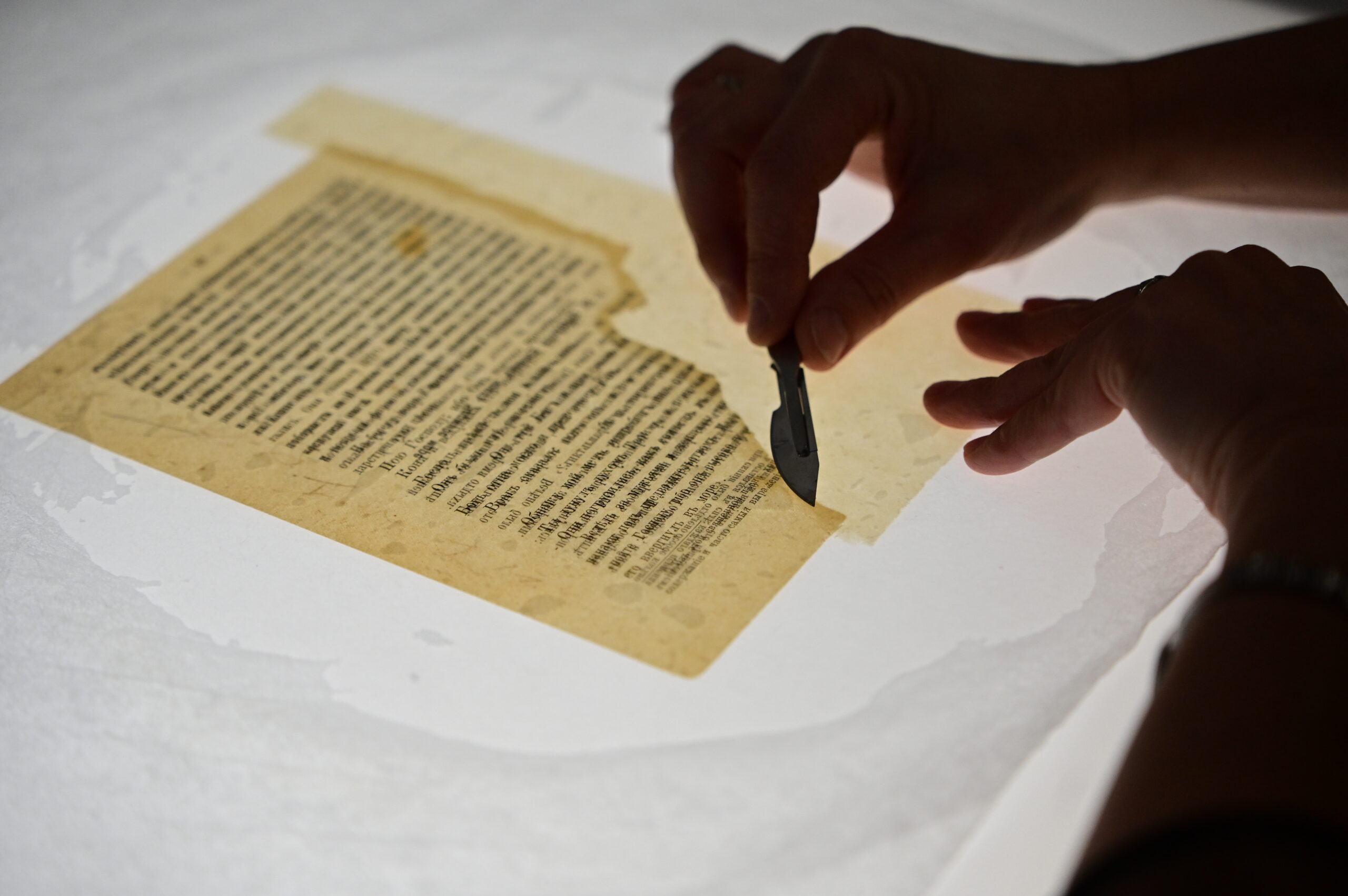 «Мою работу можно разделить на два основных направления – это консервация и контроль климата хранения, включающий температурно-влажностный и цветовой режимы. Чем я пользуюсь? Это термогигрометр, который помещается между листами, а также влагомер, благодаря нему можно измерить влажность внутри листа. Кроме того, перед реставрацией мы обязательно измеряем кислотность документа и проводим исследование состава по волокну», – рассказывает Анна Тищенко.
