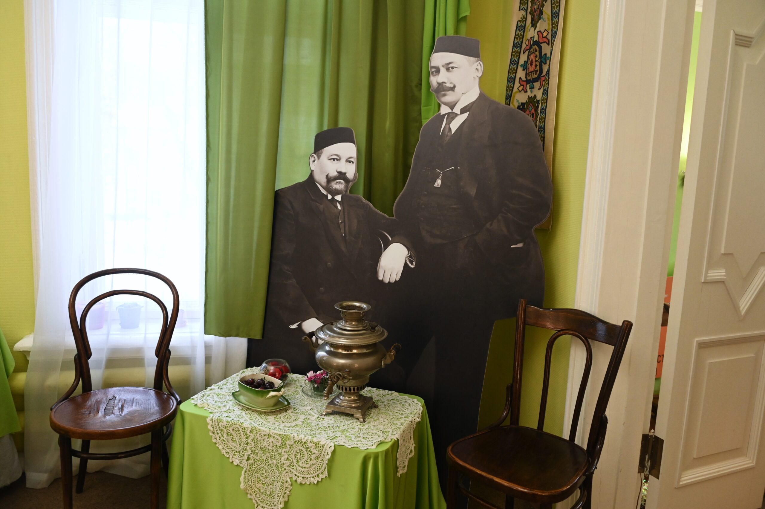 В юбилейные дни в этой «старой комнате» размещено что-то вроде большого старого телевизора. На экране сменяют одна другую фотографии из семейного архива Агафуровых, но они не просто чередуются. Каждая, застыв на несколько секунд, вдруг оживает (вот где к месту животворящая сила ИИ!): кто-то читает – листая книгу, кто-то качается на качелях – именно качается, вот мужское трио с гитарой и балалайками – берут аккорды, а вот дети на мас­караде… Ожившие снимки производят гипнотическое впечатление, воссоздавая прошлое этого дома.