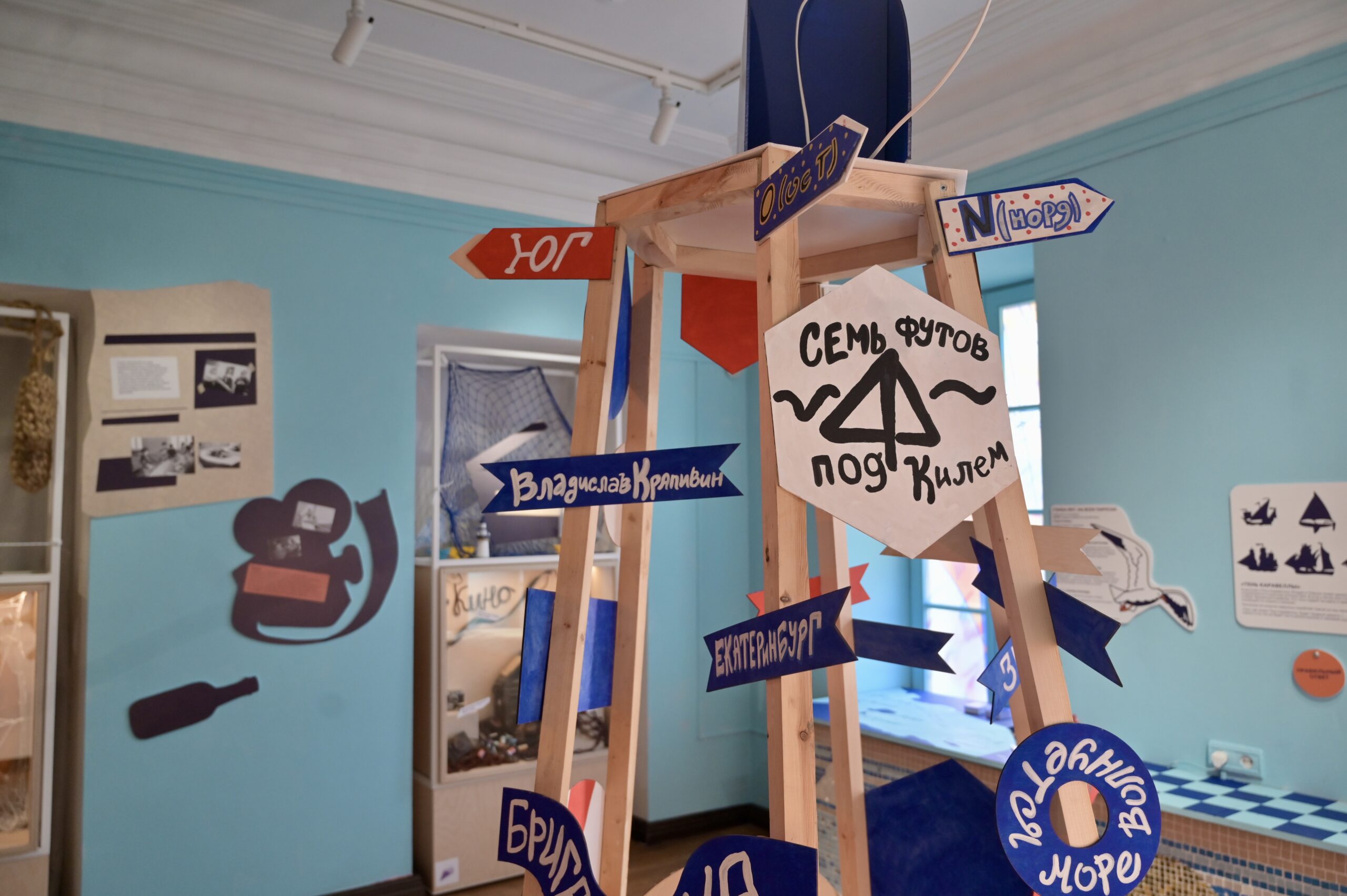 Экспозиция поражает с первого взгляда: несколько залов – будто иллюстрации к самым известным романам Владислава Крапивина. Выставка начинается с импровизированного корабля, штурвал которому заменяет велосипедное колесо, а рынду – железное ведерко. Так выглядела «Бандерилья» – придуманный корабль, с которого началось легендарное приключение, длящееся уже 65 лет. Если покрутить штурвал, начнется рассказ о первых днях отряда и биографии Командора.