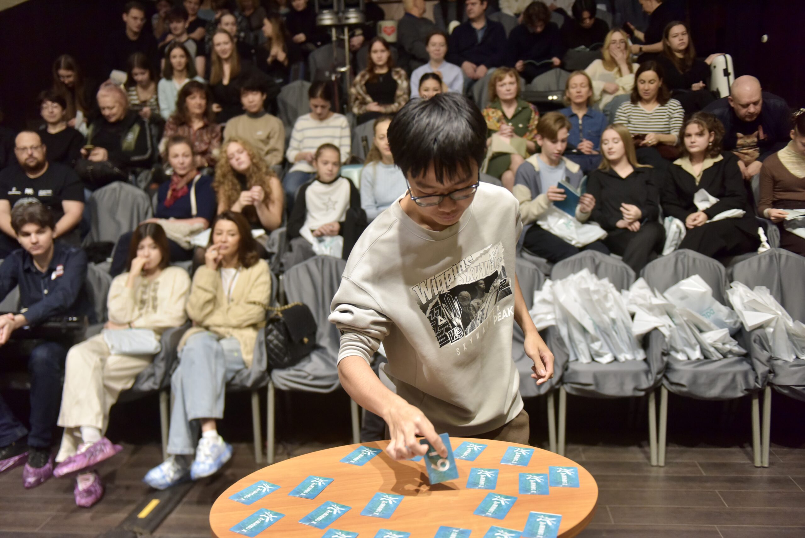 Вообще, номера «1» и «13» объявляются в особой атмосфере. Живые глаза, улыбки. Даже реплики из зала. Но в любом случае — поддержка. Конечно же, они все волнуются. Кто-то неправильно показывает и называет свой номер («Не «6», а «9» — поправляют из зала). Кто-то забывает взять подарочный пакет с буклетом конкурса и фирменной футболкой ДеМЮКС. И чем меньше остается на столе номеров — тем выше волнение: у последних по алфавиту практически уже нет выбора. Самому последнему (на столе — единственная карточка) не без юмора советуют: «Поаккуратней с выбором!». Но и юмор тут — поддерживающий.