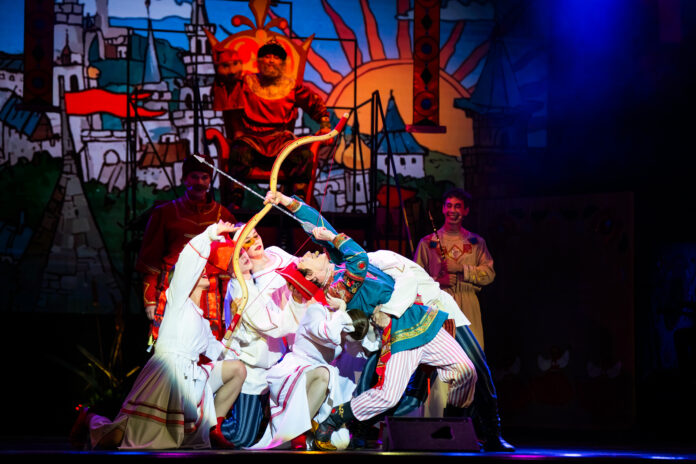 История общеизвестна. Батюшка-царь мечтает о внуках и потому отправляет трех своих сыновей за невестами. Они отправляются каждый своей дорогой и находят разное счастье. Старший сын — прирожденный экономист. Счеты под мышкой — часть его образа. Средний не представляет свою жизнь без вечеринок и дискотек, а потому не расстается с маракасами. Их невесты, избалованные купеческие дочки, забавны в своем заблуждении, что для семейного счастья нужна лишь красота да командный голос. Однако, как и полагается по сюжету, радуют свекра образцами своей выпечки и рукоделия. А вот младший непутевый сынок Ваня, бегающий вдоль зрительских рядов с «воздушным змеем» — белой птицей на длинных тростях, и его избранница Царевна-лягушка контрастируют с парами старших братьев. У тех чаяния и радости — приземленные, а Ванюшка с Царевной-лягушкой поют о любви, и романтические арии влюбленной пары поднимают спектакль на неземную высоту.