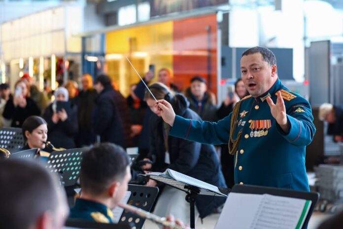 Музыканты 25-го военного оркестра штаба Центрального военного округа уже не первый раз выступают в аэропорту. В год 80‑летия Великой Победы музыканты приезжали в Кольцово на 23 Февраля и 9 Мая.