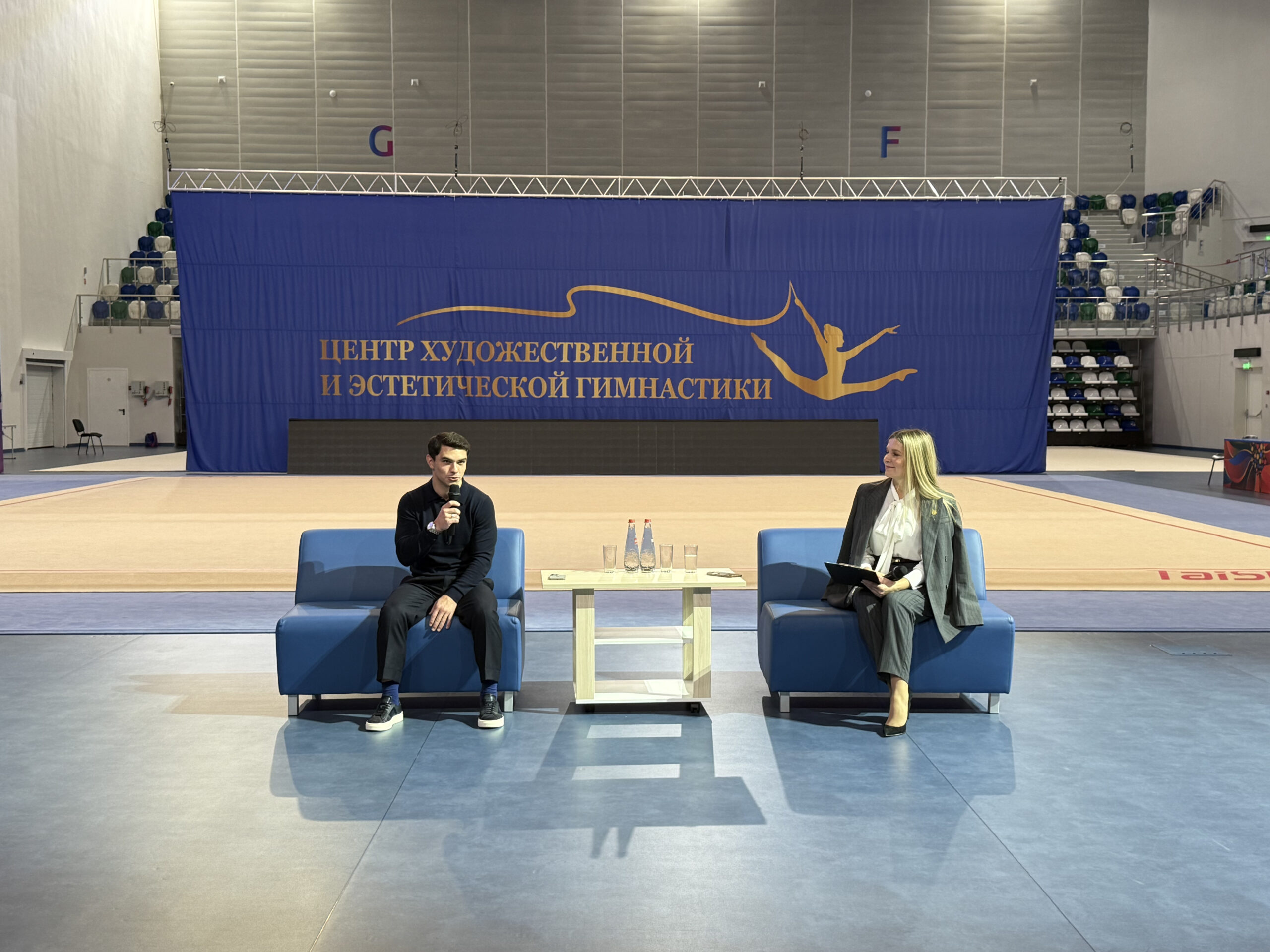 Встреча прошла в формате открытого диалога. Титулованный гимнаст активно общался с детьми, отвечал на их вопросы и даже провел для ребят небольшую разминку.