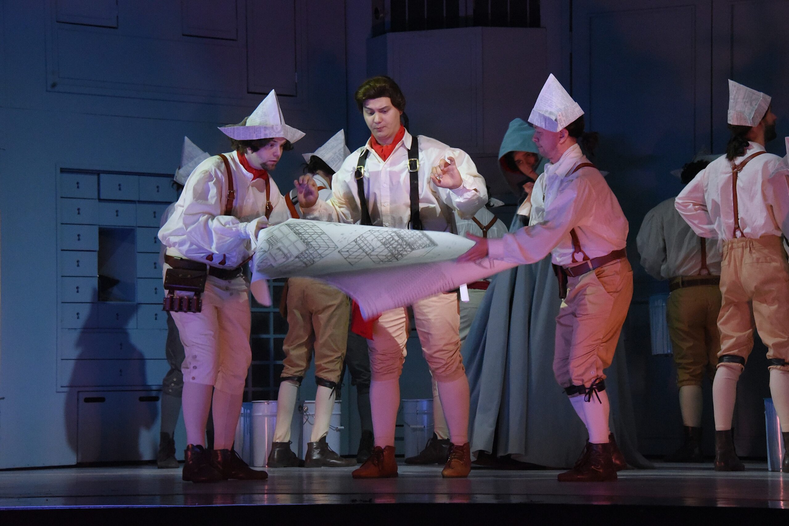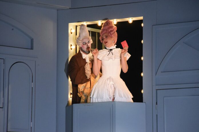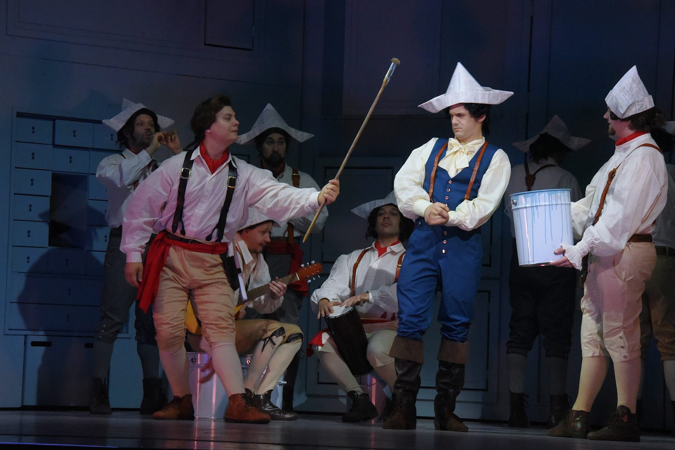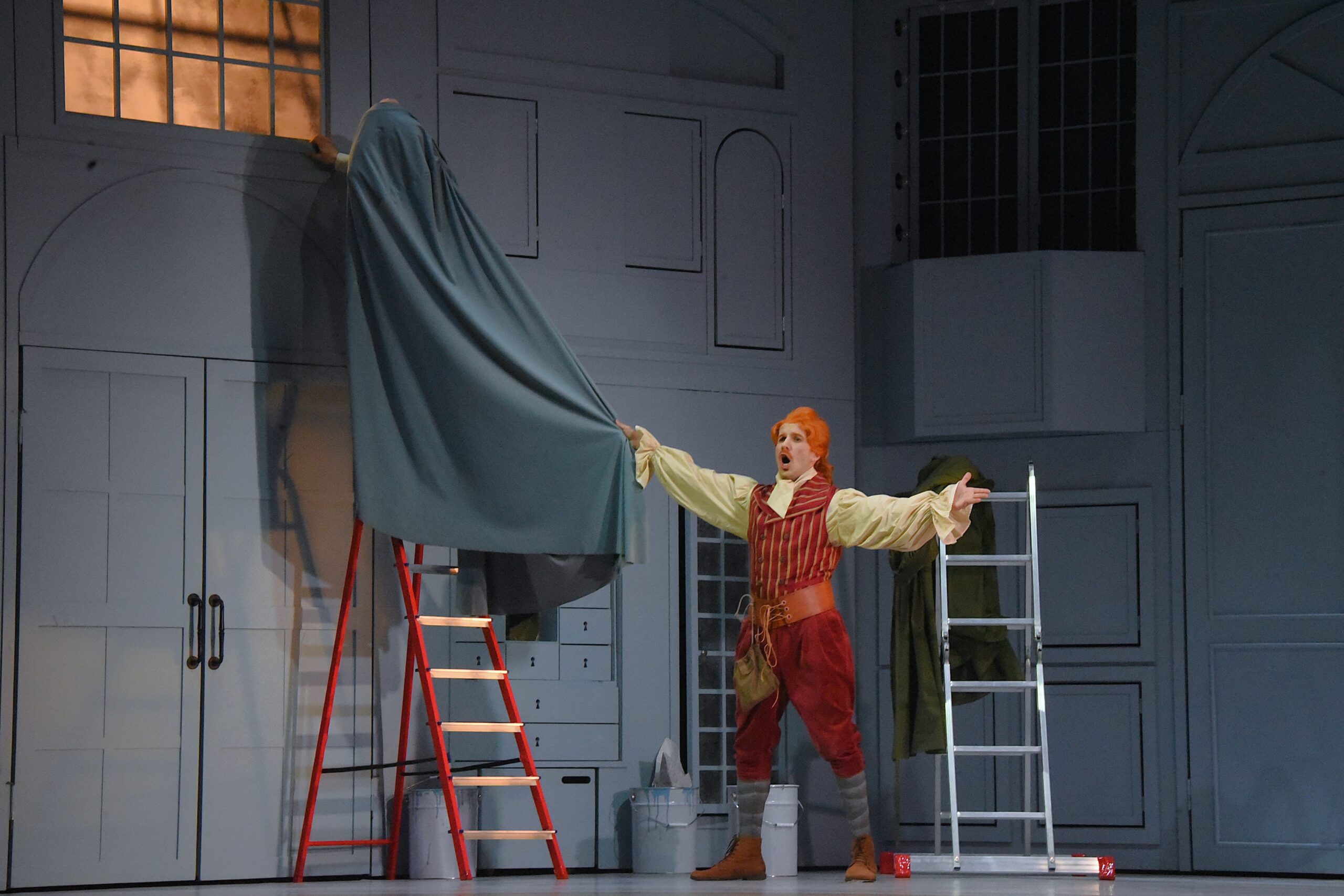 В доме-шкатулке постоянно происходят какие-то удивления, фокусы (художник по декорациям и костюмам Ксения Кочубей). Но и они — «в эпохе». Современный, из XXI века, взгляд на времена Бомарше и Россини подчеркивают лишь несколько акцентов: хор, переодетый в маляров, которые заканчивают покраску шкатулки, да сигнальная бело-красная лента, что используется для временного ограждения места «ремонтных работ». Мелочь! Забавная, но уместная. Продолжающая ту самую «игру в игре», но не подавляющая галантную эпоху Россини.