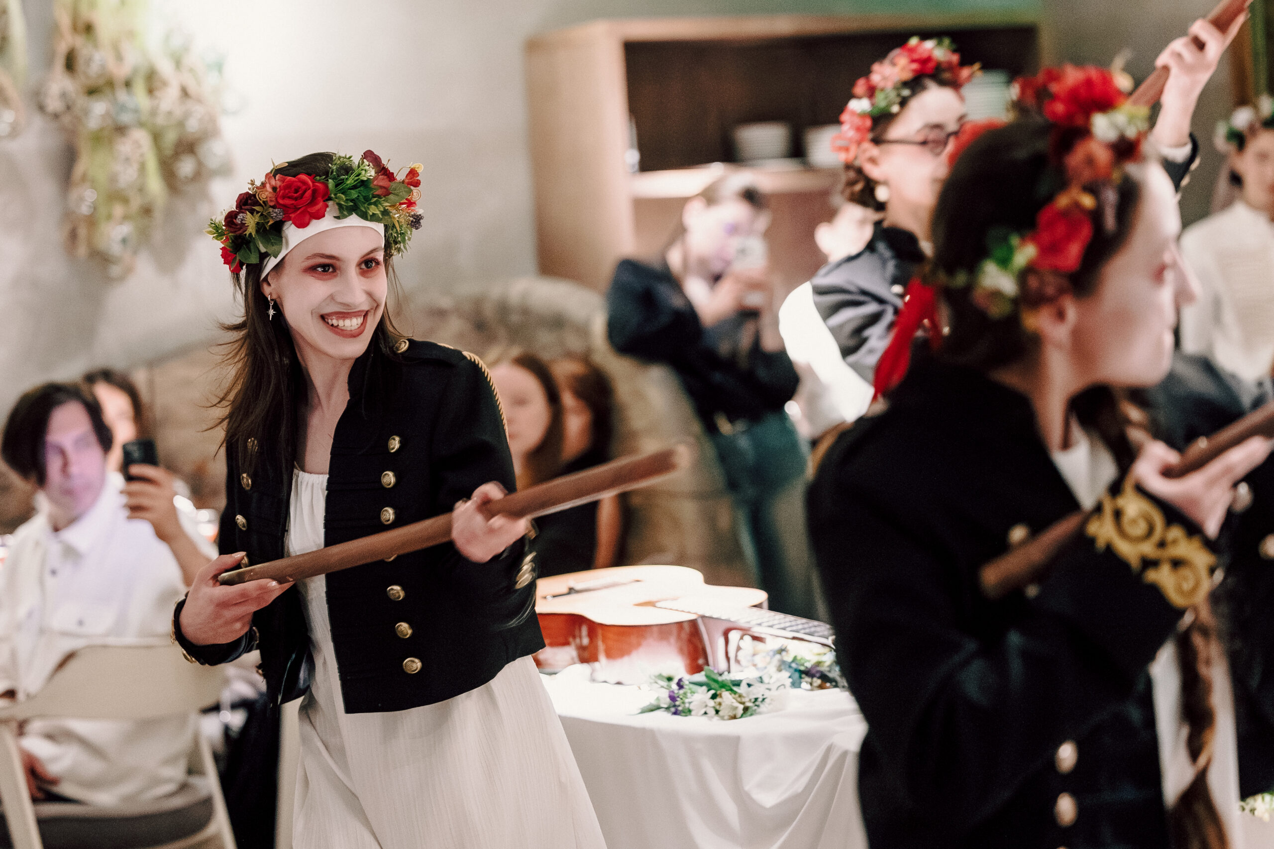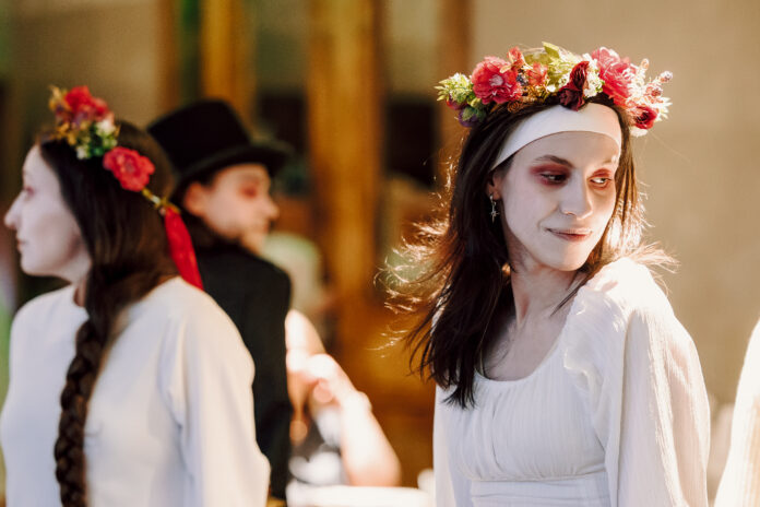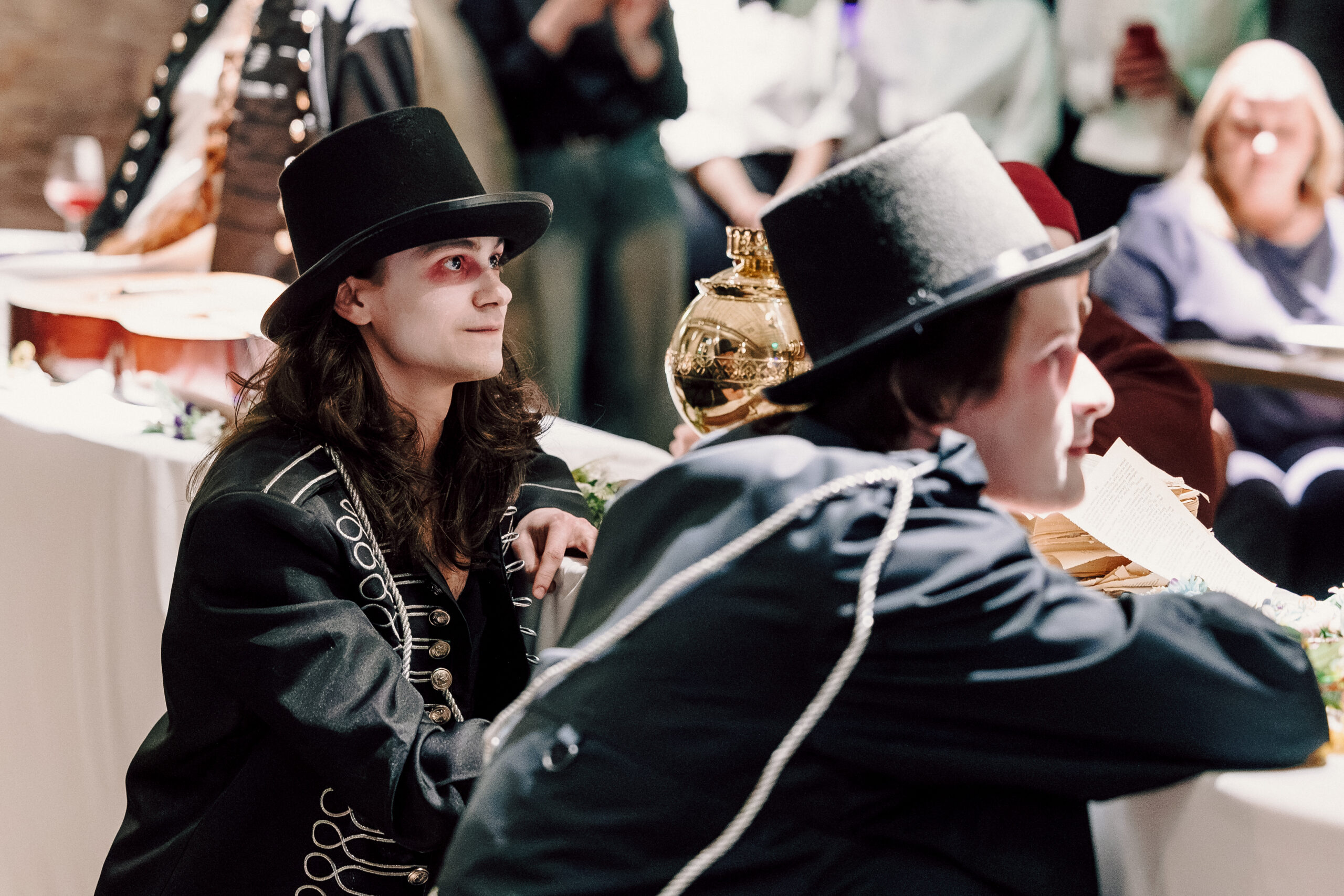 Костюмы и грим мы увидели уже на именинах: персонажи спектакля появились с выбеленными лицами и розовыми кругами под глазами, придающими им усталое и немного обреченное выражение.