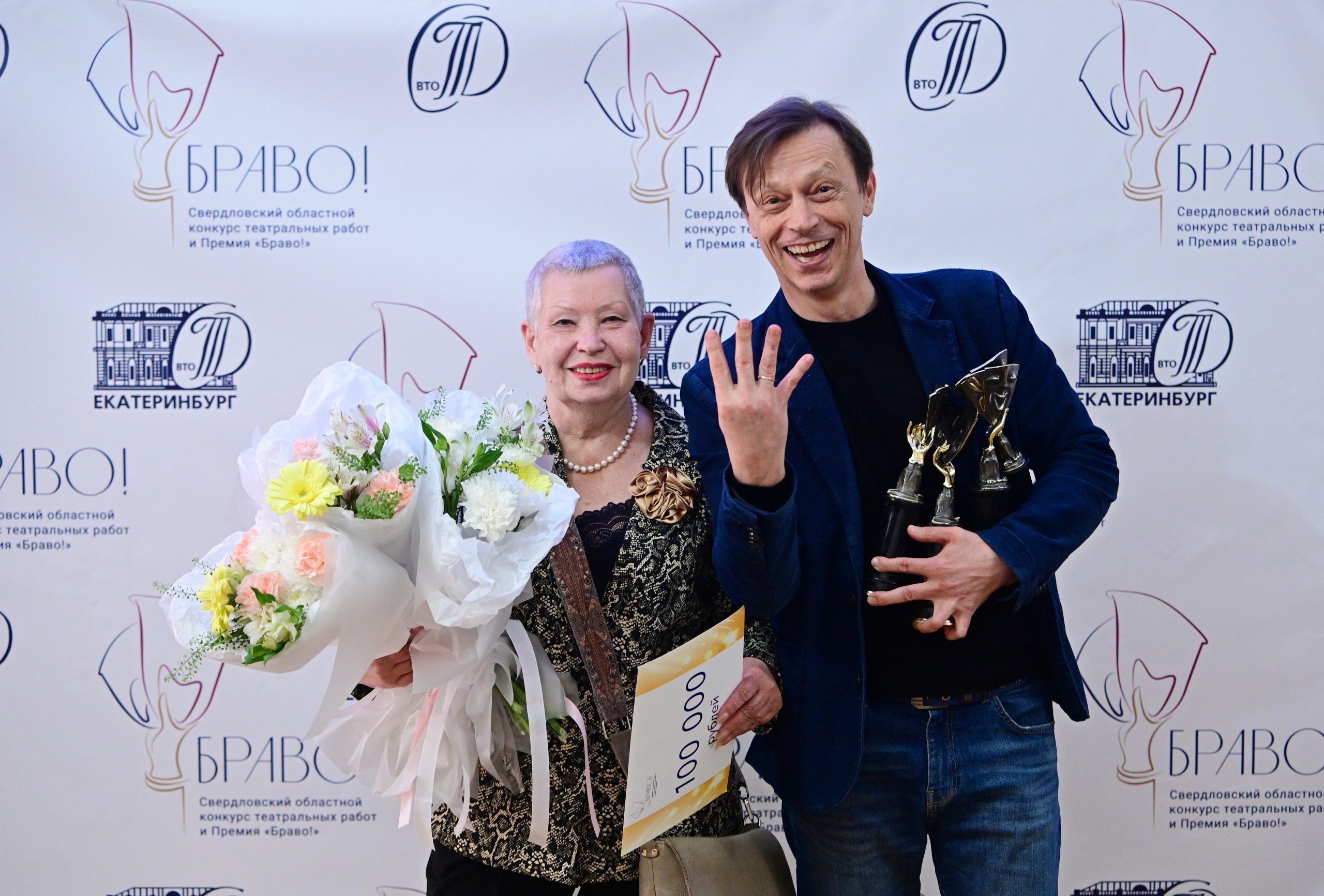Художественный руководитель Игорь Булыгин и директор Нижнетагильской драмы Ольга Анисимова намекают на количество призов, которые увезли с собой. Фото: Павел Ворожцов, «Областная газета»