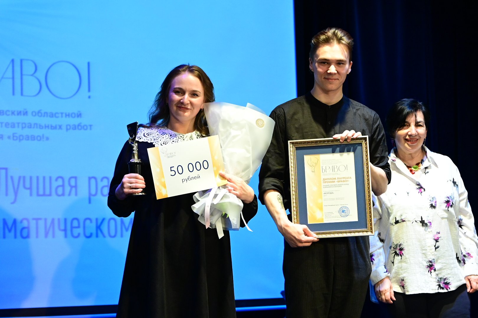 Больше всего претендентов на «Браво!» было в драматическом театре – сразу 28 номинантов. В итоге по одной статуэтке получили Екатеринбургский театр юного зрителя (лучший режиссер – Анатолий Праудин, «Горе от ума»), Екатеринбургский театр «Волхонка» (лучшая женская роль – Полина Дьячок в спектакле «С неба упали три яблока»), Серовский театр драмы им. А.П. Чехова (лучшая женская роль второго плана – Светлана Виниченко в спектакле «Одни») и Новый Молодежный театр Нижнего Тагила за лучший спектакль малой формы («Володя», режиссер Ярослав Рахманин).