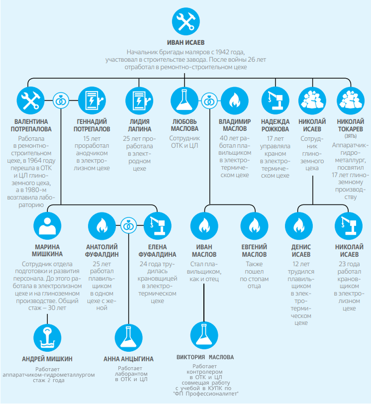 Павел Иванович работал на БАЗе выливщиком, а его сын Александр — мастером-электриком. Жена Александра Зинаида Петровна отработала на 6-й серии электролизного 19 лет. Для Александра Павловича завод стал вторым домом на долгих 36 лет. Не только сын и отец посвятили себя БАЗу: двое сыновей-близнецов и дочь Александра и Зинаиды пришли работать на завод, а после династию продолжили их внуки и правнуки.