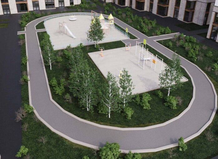 На территории установят двойные качели, карусель, детский игровой комплекс, спортивный комплекс, а также баскетбольную стойку с кольцом. Благоустройство дополнят лавочки и урны, по периметру площадки будет уложен бордюрный камень.