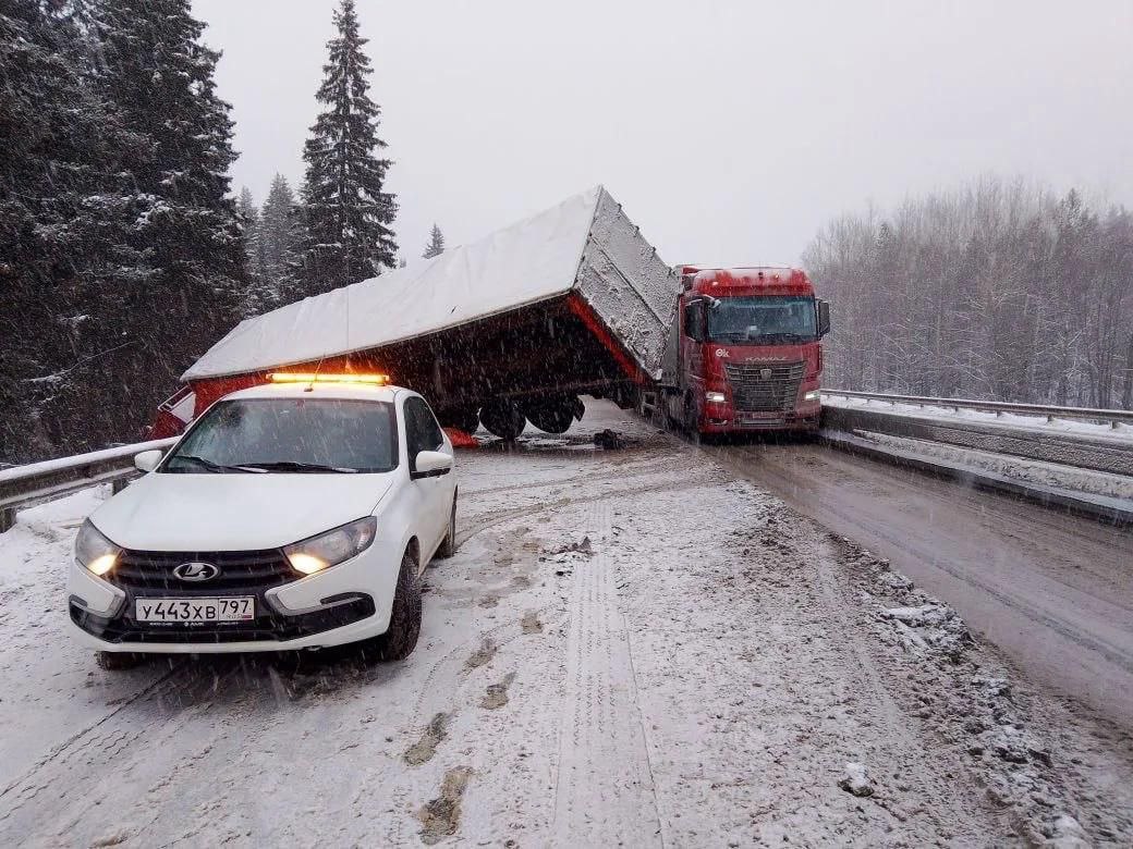 Сейчас экипаж ГИБДД совместно с краном прибыли на место происшествия для эвакуации грузового автомобиля. После три комбинированные дорожные машины проведут расчистку участка.