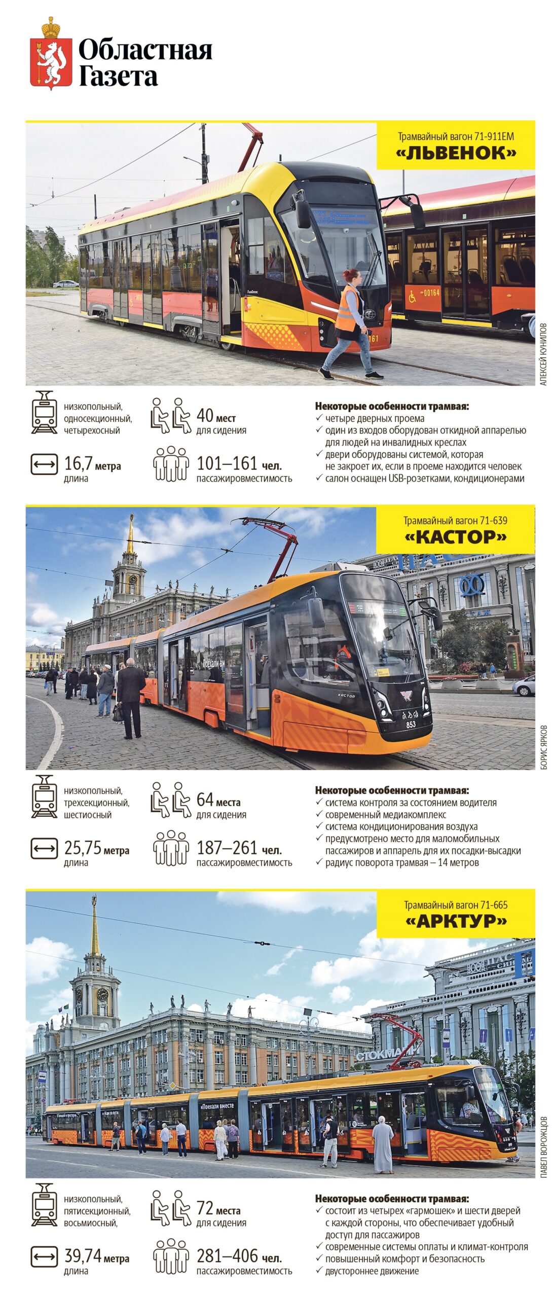 «Со стартом транспортной реформы в Екатеринбурге мы заменили половину троллейбусного парка, закупив 100 электромашин. Также в начале года в город прибыли два трамвая, затем — 15 автобусов-гармошек. В этом месяце на линии вышли 7 новых трехсекционных трамваев. Один пятисекционный вагон также работает на маршруте № 18. На маршрутах № 15 и № 16 задействованы односекционные трамваи — большие, удобные и для пассажиров, и для водителей, — говорит заместитель генерального директора ЕМУП «Гортранс» Андрей Ившин.