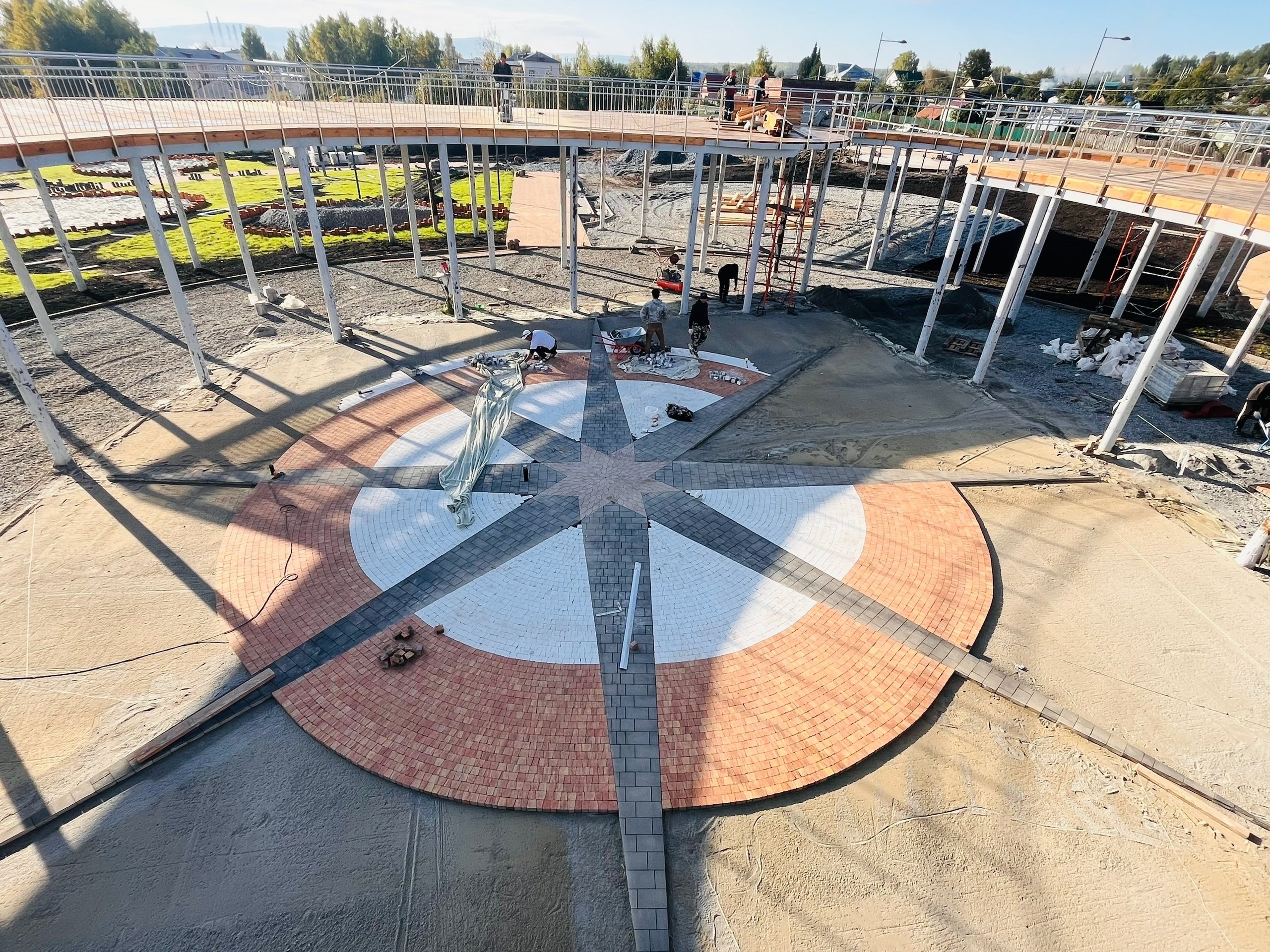 Пока погода позволяет, продолжаются укладка плитки, монтаж ограждения и обустройство санитарной зоны. Ведется обустройство автостоянки. Уже завершена подготовка инженерных сетей для будущего сухого фонтана.