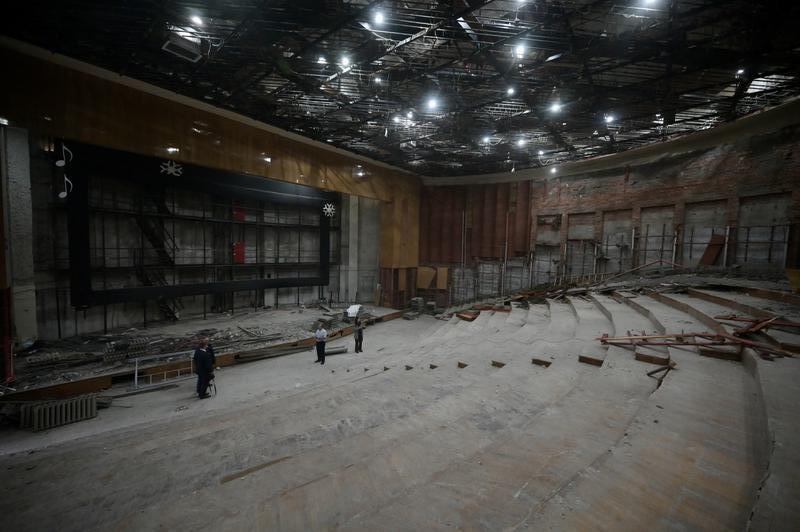 Уже демонтированы полностью потолки на сцене и в зале, стены и полы. Заново будет монтироваться отопление, новые батареи уже завезены. Заново будут монтироваться стены из специальных панелей, а также звукоизоляция.