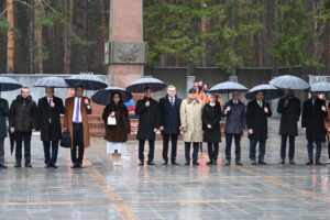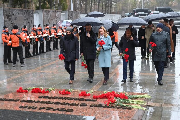 Первый объединенный визит глав дипломатических миссий стран — членов Лиги арабских государств, организованный Правительством Свердловской области при поддержке МИД России, стартовал 21 апреля на Среднем Урале с торжественно-траурной церемонии. Дипломаты почтили память героев Великой Отечественной войны минутой молчания и возложили цветы к Вечному огню на Широкореченском военно-мемориальном комплексе. Об этом «ОГ» сообщили в Департаменте информационной политики региона.