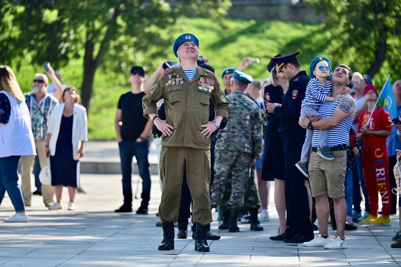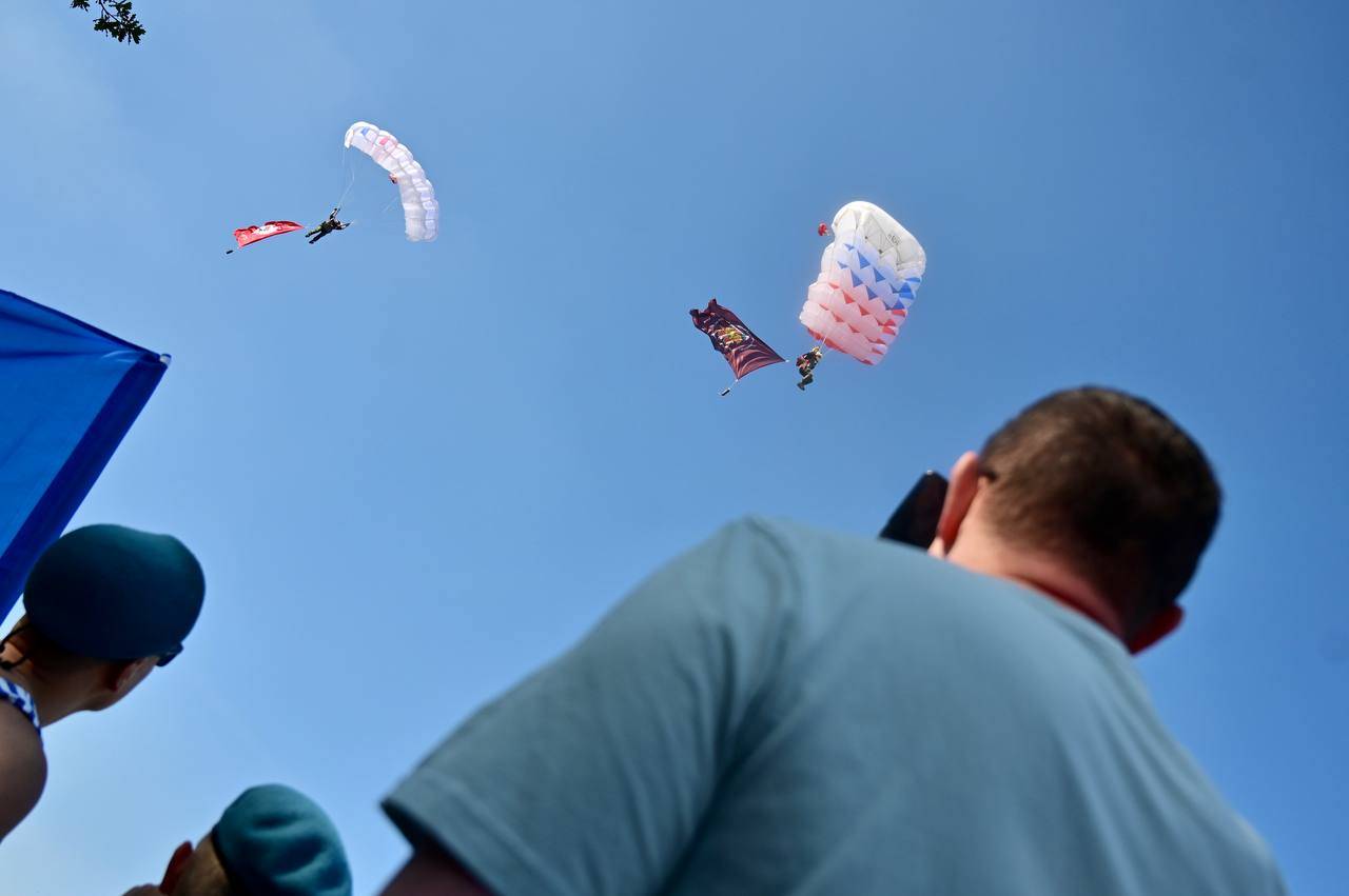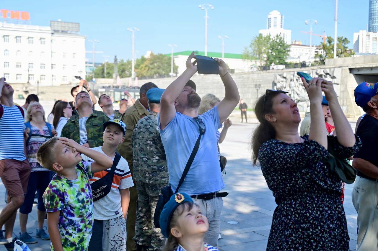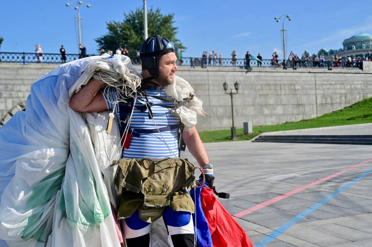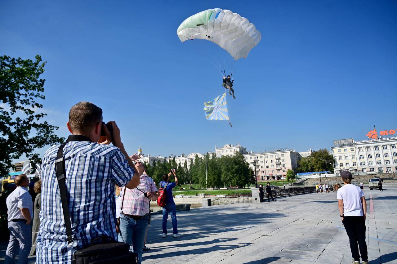 В Екатеринбурге начали праздновать День ВДВ. Празднование началось с показательных прыжков спортсменов-парашютистов в Историческом сквере, а затем десантники строем прошли по проспекту Ленина к мемориалу «Черный тюльпан» — там состоялся памятный митинг с возложением цветов.