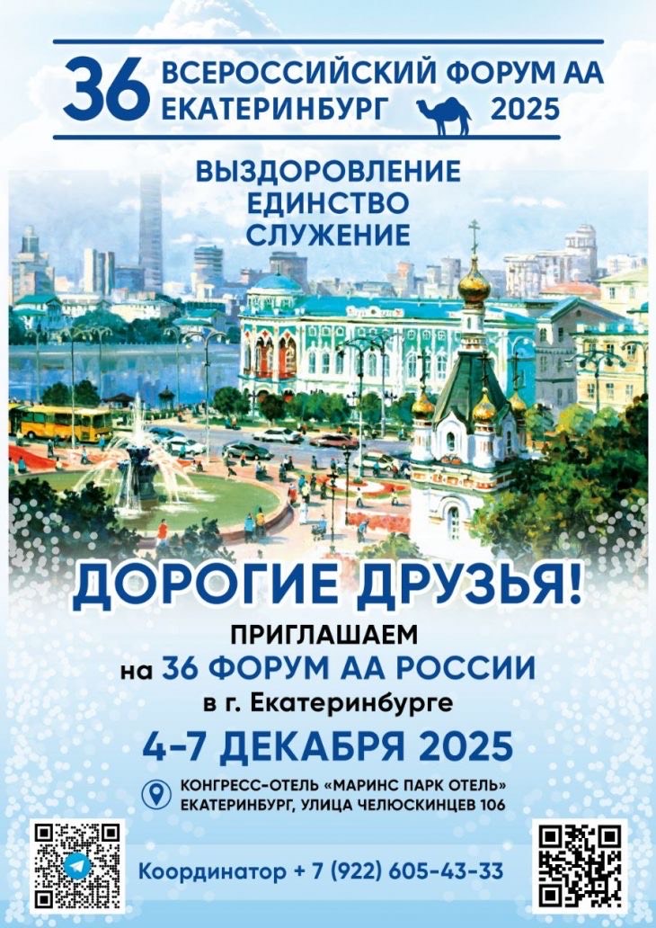 Кроме того, в Екатеринбурге продолжается активная подготовка к XXXVI Форуму АА России, который состоится в столице Урала. Оргкомитет проводит регулярные встречи, где распределяются обязанности и решаются ключевые организационные вопросы. Актуальная информация о Форуме доступна на специальном сайте: https://forum36.aa-ekb.ru/.