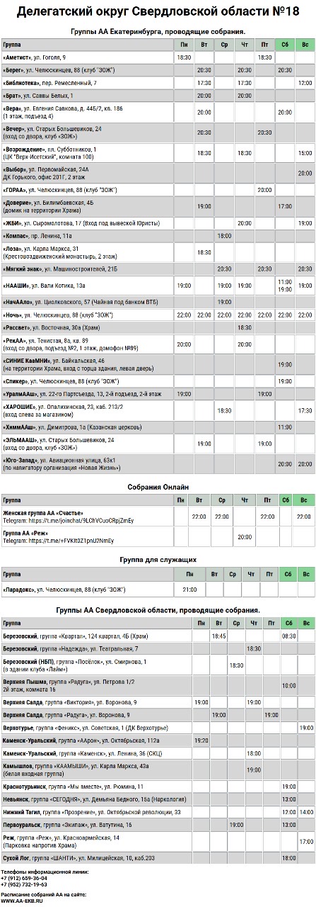 Женская группа АА «Счастье» проводит регулярные онлайн-собрания по вторникам, средам, пятницам и воскресеньям в 22:00 (по екатеринбургскому времени). Это поддерживающее пространство, где женщины делятся опытом выздоровления. Присоединиться можно по ссылке: https://t. me/joinchat/9LChVCuoCRpjZmEy.