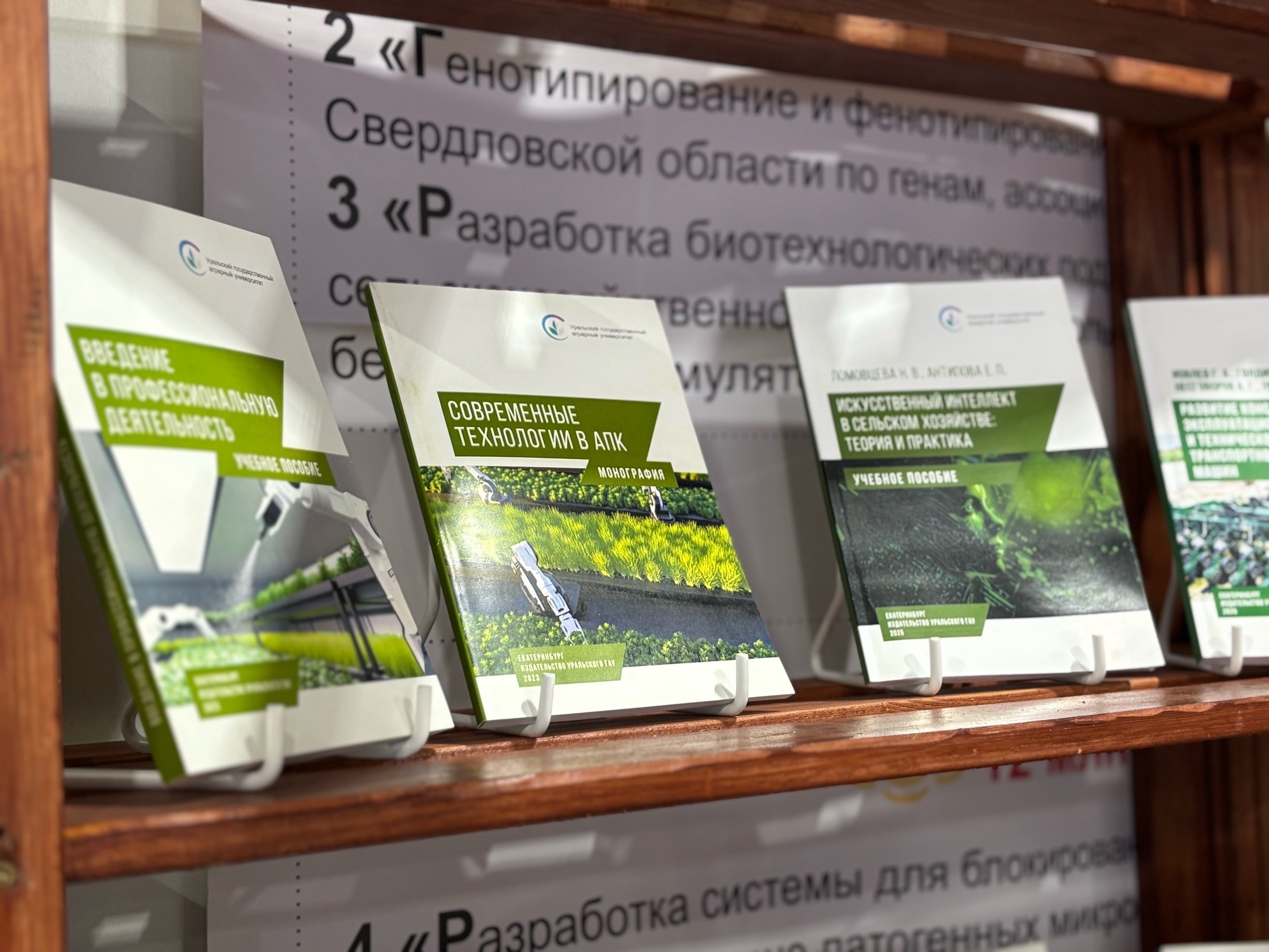 На стенде УрГАУ гости познакомились с перспективными продуктами и решениями, в том числе с научно‑практическими рекомендациями, монографиями и учебными пособиями по актуальным вопросам развития АПК.