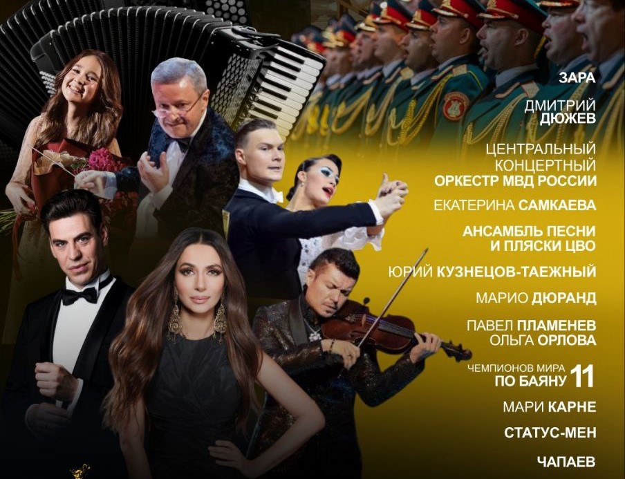Перед зрителями выступят Центральный концертный оркестр МВД России под руководством заслуженного артиста РФ Феликса Арановского, актер Дмитрий Дюжев и певица Зара, 11 чемпионов мира по аккордеону и баяну, народный артист Республики Дагестан, заслуженный деятель культуры Перу Марио Дюранд с уникальной скрипкой итальянского мастера XVII века Пьетро Гварнери, финалисты чемпионата мира по бальным танцам.