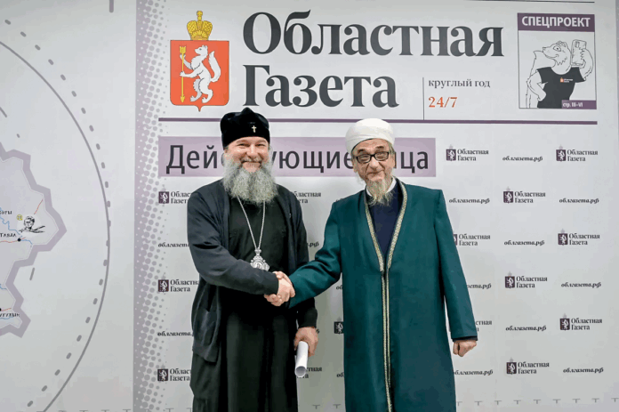Митрополит Екатеринбургский и Верхотурский Евгений и председатель Духовного управления мусульман Свердловской области (Центральный муфтият) Абдуль-Куддусс Ашарин презентовали журналистам редакции «ОГ» и их юным коллегам новый совместный масштабный проект «Эпоха героев и побед». Он направлен на гармонизацию межрелигиозных и межнациональных отношений и противодействие идеологии экстремизма и терроризма, оказание духовной поддержки участникам СВО и членам их семей. Напомним, первый в истории Среднего Урала совместный визит духовных руководителей церкви и муфтията в редакцию СМИ состоялся год назад — и тоже в «Областную газету».