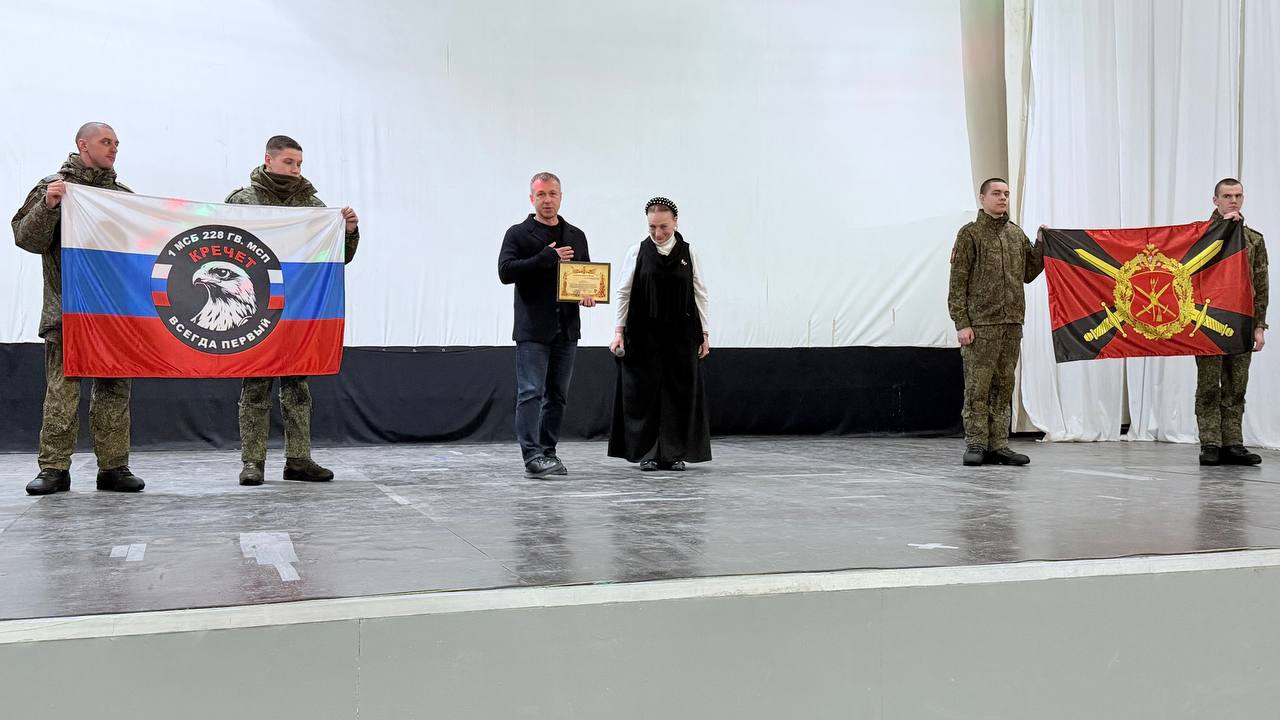 От лица командования 32-го военного городка за вклад в патриотическое воспитание Сергею Павленко вручили боевые символы — флаги 1-го мотострелкового батальона 228-го Гвардейского мотострелкового полка «Кречет» и флаг сухопутных войск России.