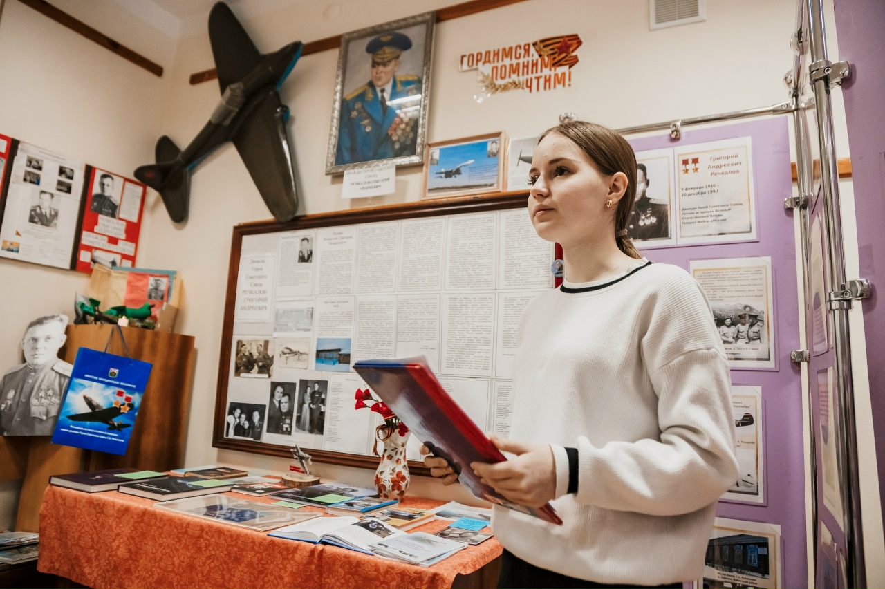 Особое внимание экскурсоводы уделили Григорию Андреевичу Речкалову, ребята включили в свой рассказ о боевых подвигах и жизненном пути героя отрывки фильма «Ас-истребитель».