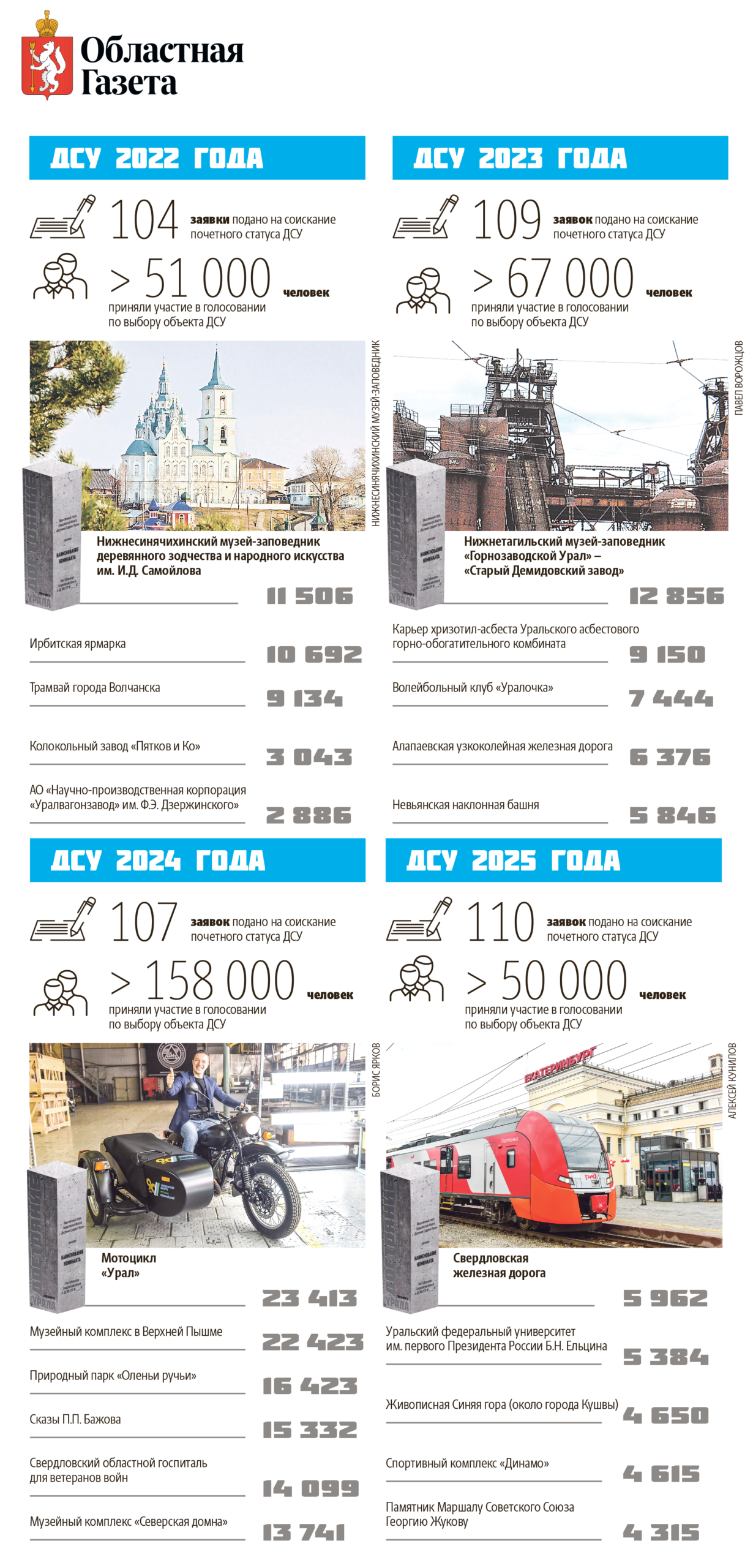Дело в том, что конкурс «Достояние Среднего Урала» – совершенно добровольный. И каждый год число голосующих растет. Но мы никого не заставляем голосовать за тот или иной объект. Да, я поначалу переживал. Почему не за этот объект? Каждого жалко. Бывает, до вхождения в пятерку победителей не хватает считанных голосов. Но конкурс у нас народный. И народ решил именно так.