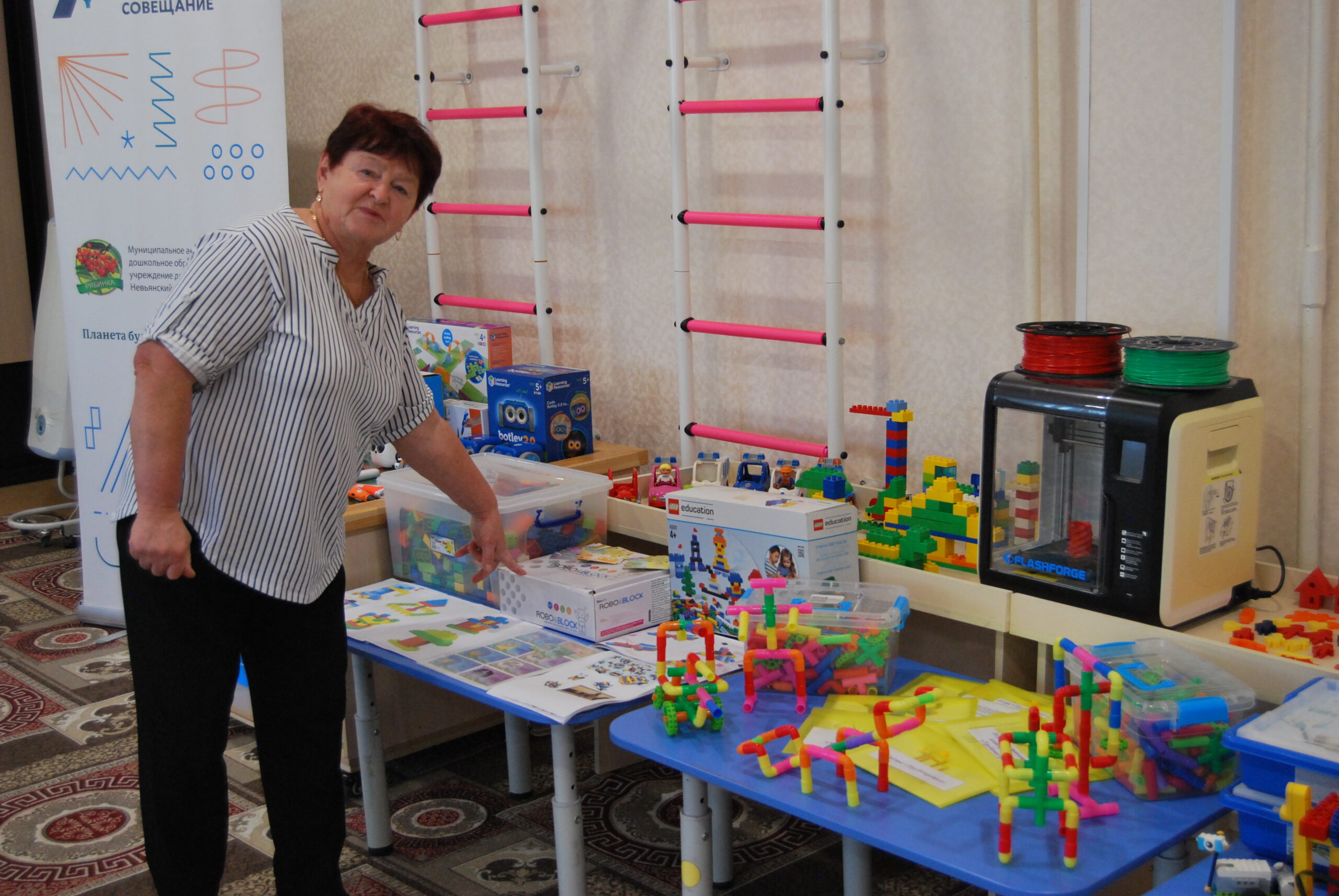 Проходим в зал. На глаза сразу попадется непривычное для детского садика оборудование — 3D-принтер, роботы, сложные конструкторы. По словам заведующей Ольги Рубцовой, вектор дошкольного образования в последние годы очень расширился, их детский сад приобрел много современного развивающего оборудования. А в 2024 году получили статус региональной инновационной площадки «Уральской инженерной школы 2.0». Воспитатели совместно с детьми принимают участие в конкурсах и проектах активно. В августе 2025-го участвовали в выставке в губернаторском лице в Екатеринбурге, где представили свои наработки по инженерной школе.