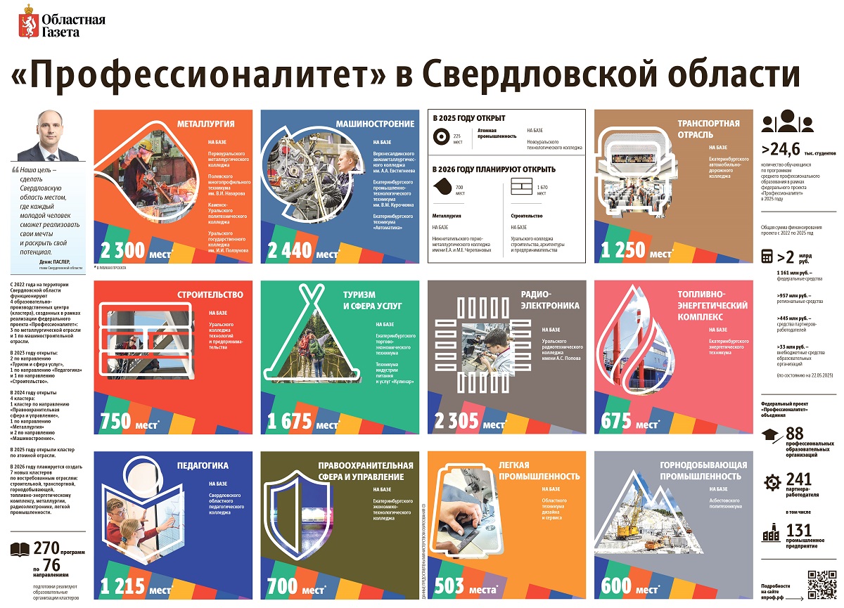 В рамках проекта «Профессионалитет» на Среднем Урале созданы уже 13 образовательно-производственных кластеров, которые объединили 88 колледжей и техникумов с более чем 240 предприятиями-работодателями.