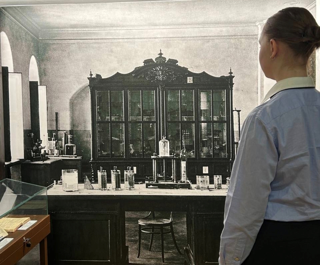 В музее представлено фотопанно кабинета физики (на фото), снимок был сделан в конце 1890-х. Когда стоишь рядом, ощущается какая-то особая атмосфера, словно ты стал гимназистом того времени. Тут же представлены предметы, которые тогда использовали для демонстрации физических явлений: шары Ньютона, трибоэлектрический и демонстрационный наборы.