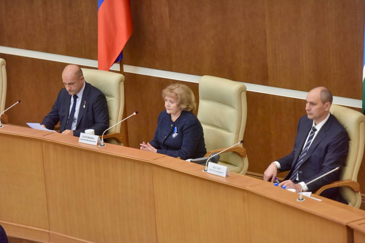 «Позвольте мне выразить слова благодарности вам, Артем Владимирович, губернатору Свердловской области Денису Владимировичу Паслеру и Президенту нашей страны Владимиру Владимировичу Путину за оценку моего труда на посту председателя Законодательного собрания. Благодаря совместной работе депутатов Законодательного собрания мы достигли результатов, позволяющих гордиться нашим законодательством. Президент России ставит перед нами серьезные задачи в законотворческой деятельности по реализации стратегии национального развития и национальных проектов. И только во взаимодействии с исполнительными органами власти, с вниманием к нуждам и проблемам наших избирателей мы можем эффективно решать эти задачи», — сказала Людмила Бабушкина.