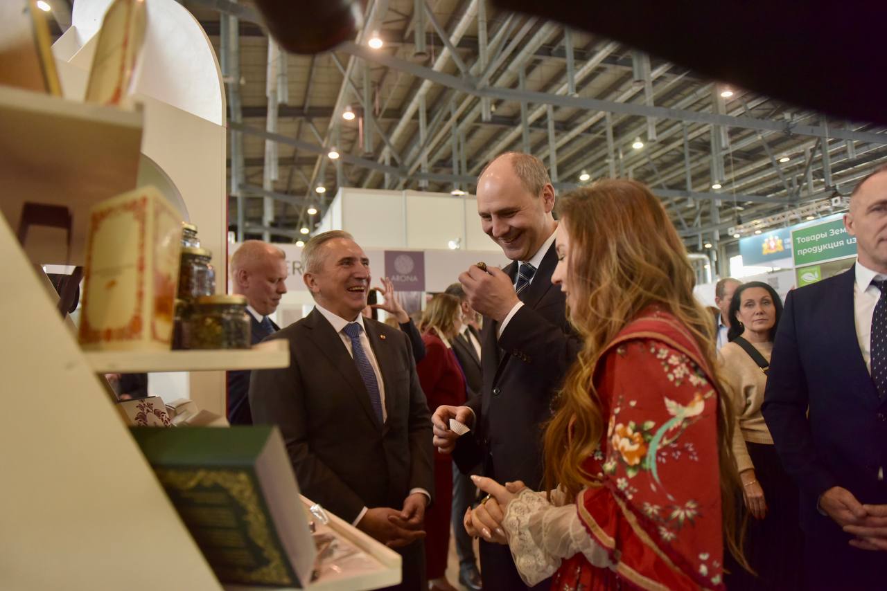 Стенд Тюменской области радует как традиционными товарами (колбасы, сыры), так и экзотикой. Дениса Паслера, например, заинтересовали уникальные тюменские конфеты с хреновиной, горчицей и перцем. Вместе с губернатором Тюменской области Александром Моором они пробуют деликатес: судя по их лицам, впечатления положительные.