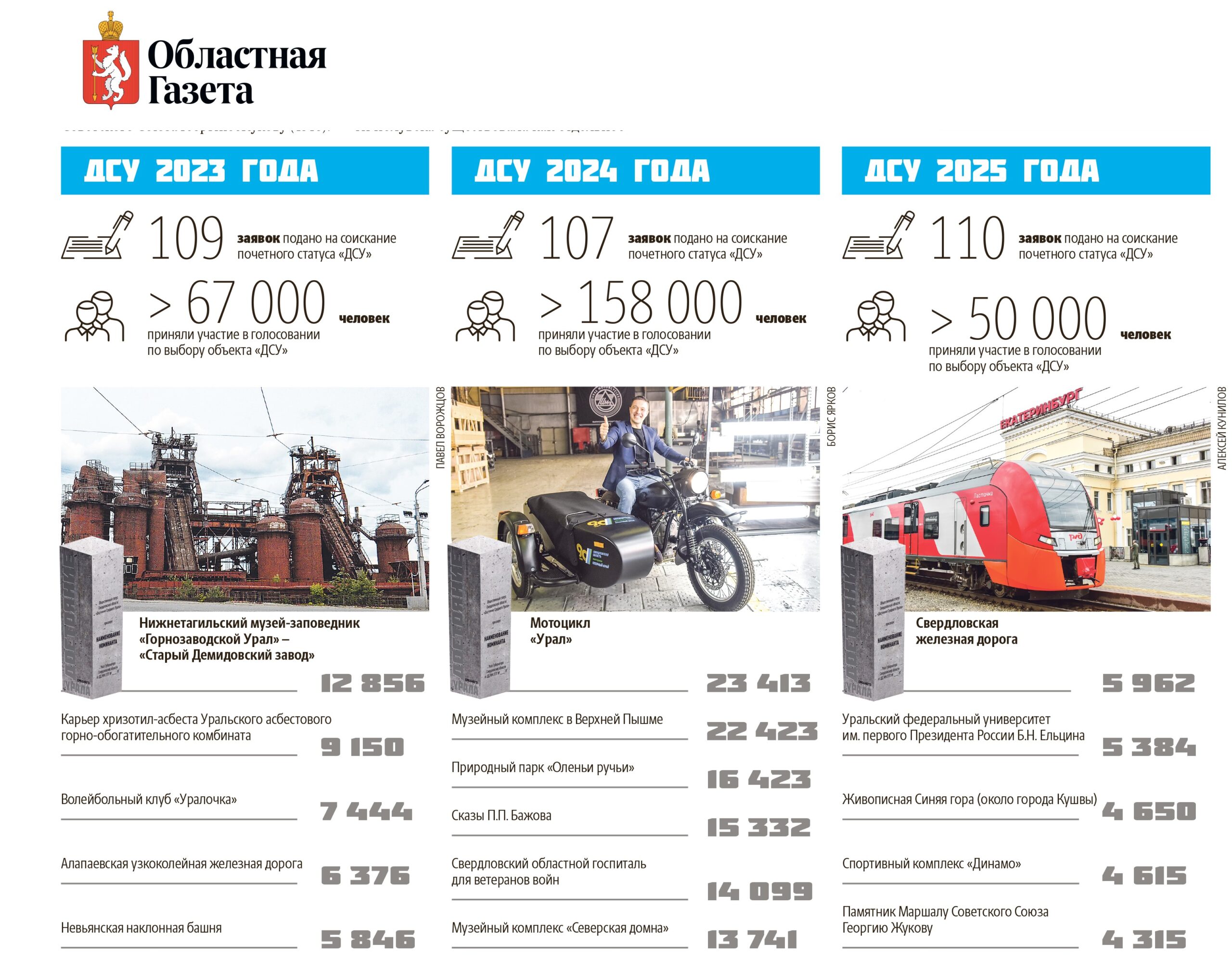 Конкурс «Достояние Среднего Урала» (ДСУ) проводился уже в четвертый раз. По положению о конкурсе, этот почетный статус может быть присвоен географическим объектам, историческим событиям, достижениям науки, художественной культуры, спорта, традиционным мероприятиям, коллективам и организациям, связанным с нашим регионом и имеющим для него особое значение. Организатор ДСУ – Общественная палата Свердловской области.