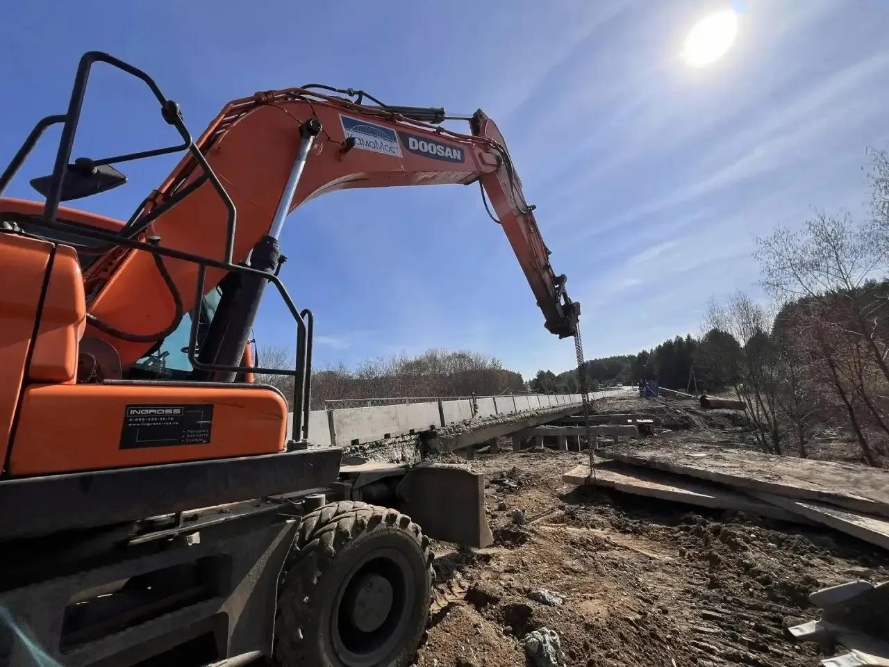 Работы ведутся в несколько этапов. Подрядчик уже демонтировал пролетные строения на левой стороне мостового перехода. При этом проезд по искусственному сооружению сохраняется — организовано реверсивное движение по одной полосе.