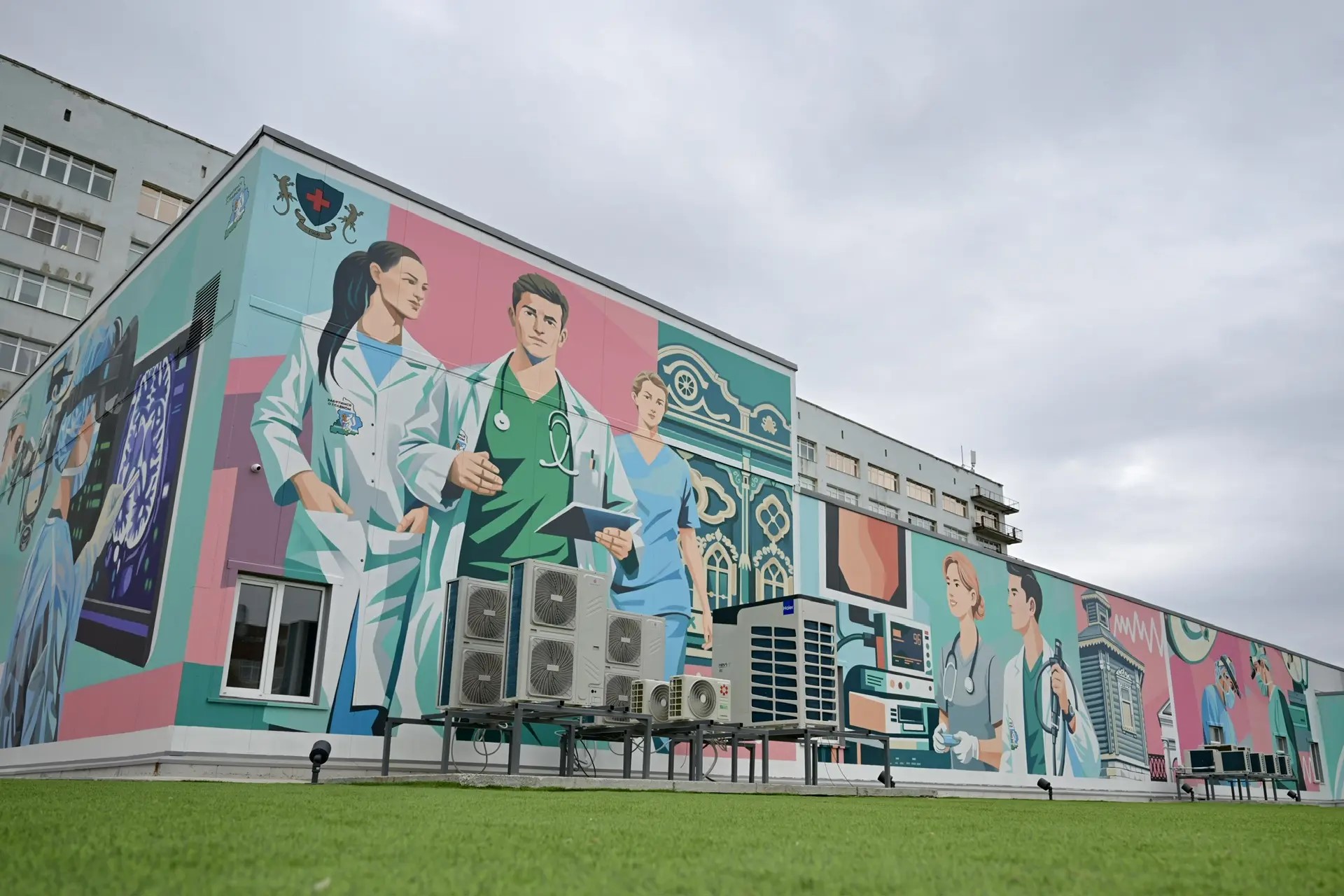Ярким акцентом на фасаде модуля стал крупнейший в России медицинский мурал. На стенах соединили сюжеты из повседневной жизни врачей Городской клинической больницы № 40 и узнаваемые объекты города.
