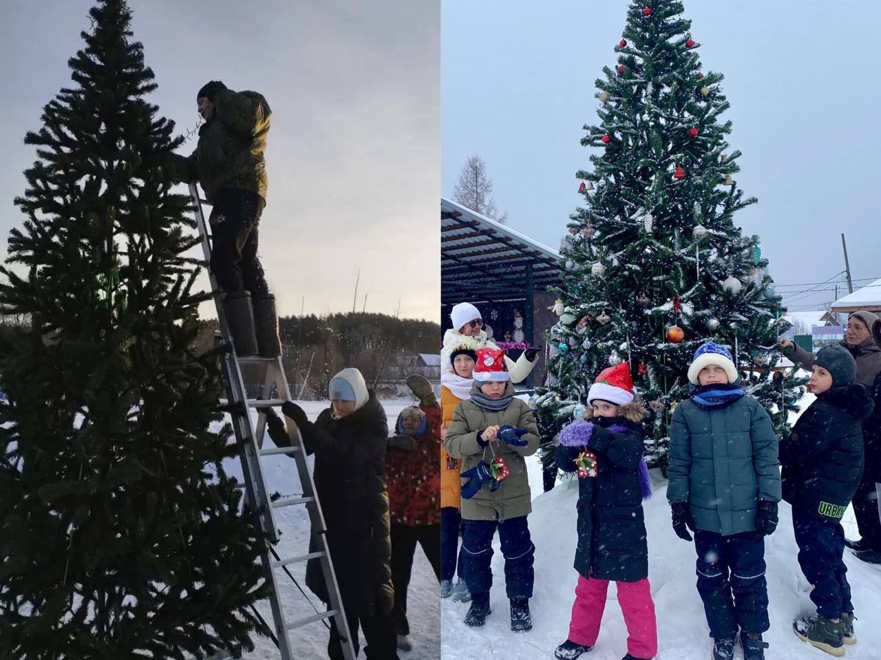 Установка ёлки прошла торжественно и весело. Взрослые и дети собрались вместе, украсили дерево гирляндами, игрушками и мишурой.