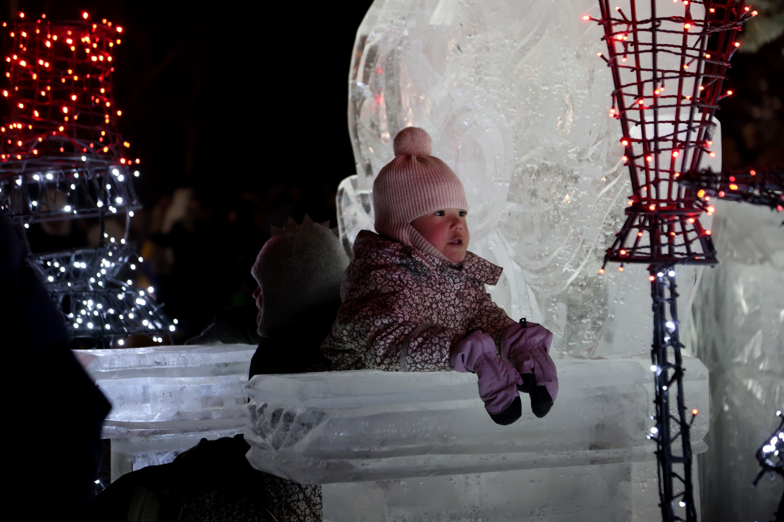 Новогодний городок украсили ледяные скульптуры и яркая иллюминация. В нем обустроены тематические фотозоны и зимняя игровая площадка с горками.