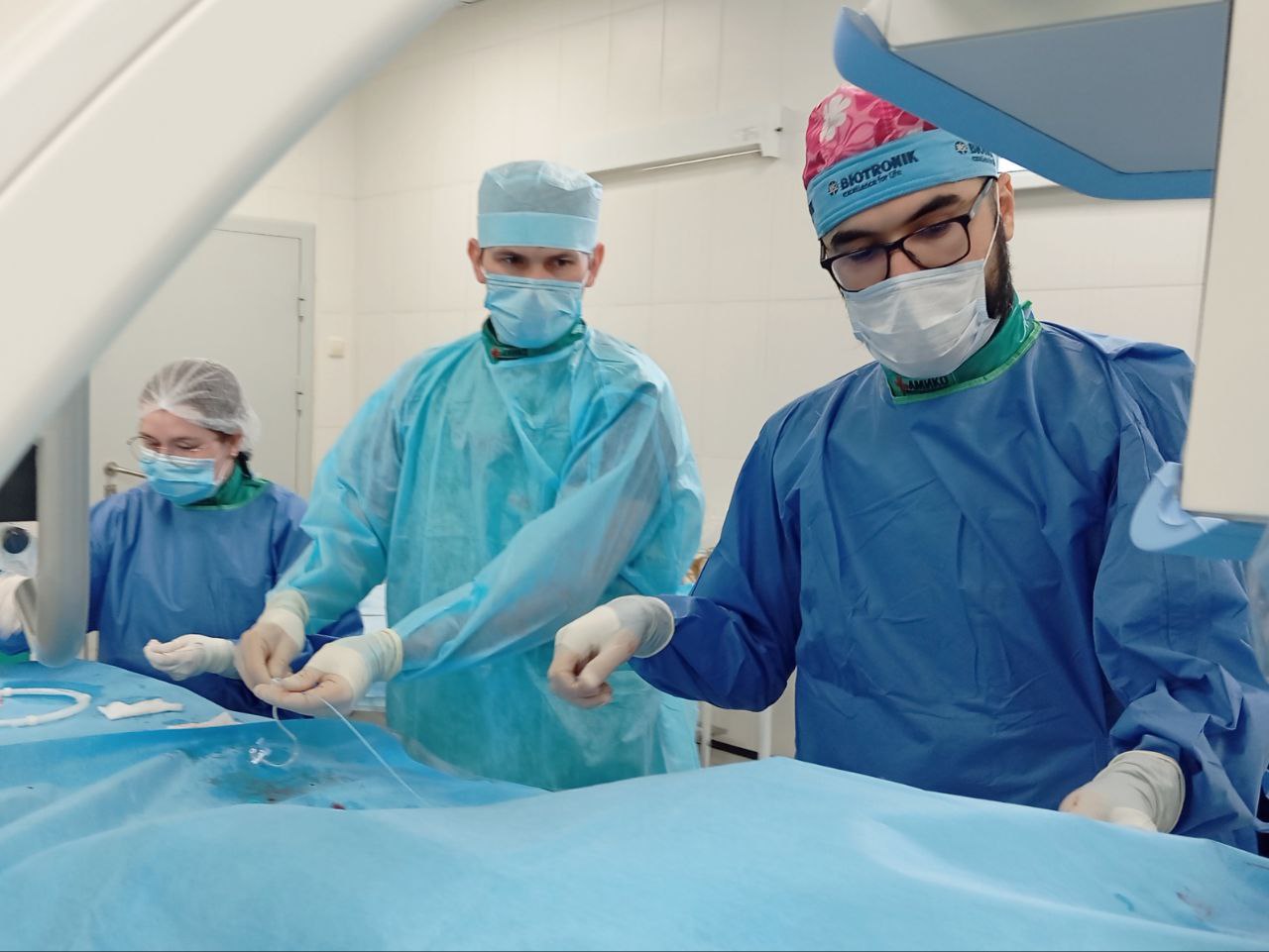 Врачи приняли решение применить современную методику с использованием специального аппарата для атерэктомии. Так, бляшки дробятся при помощи небольшого бура, а кальцинат выводится из сосуда с кровотоком в специальный контейнер. Оборудование призвано восстанавливать проходимость участков сосудов, подверженных сгибанию и подвижности, где использование стентов нежелательно из-за риска поломки.